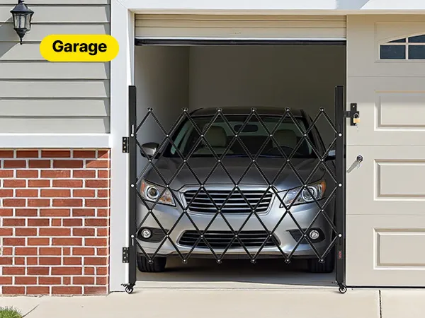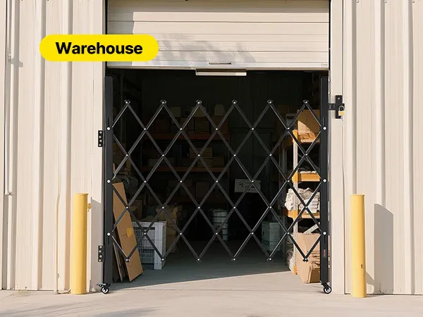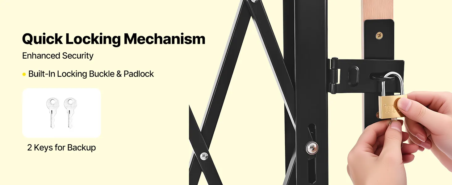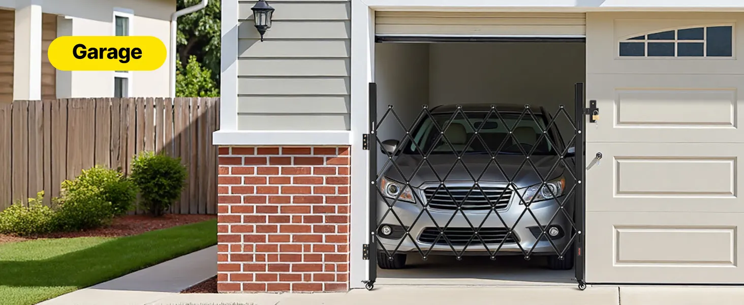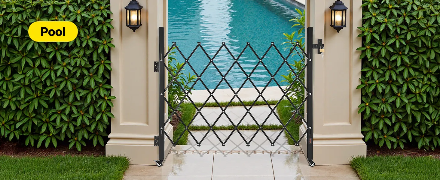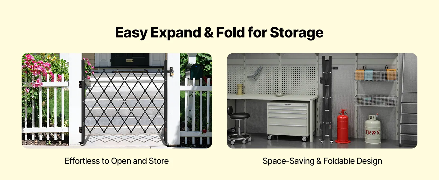 Our folding security gate is made of durable channel steel with a black powder coating for extended use. It features a lock for enhanced security and comes with an installation kit, making it ideal for busy hallways or entrances in commercial settings.