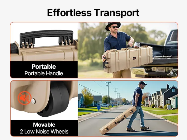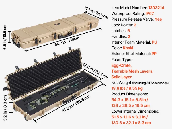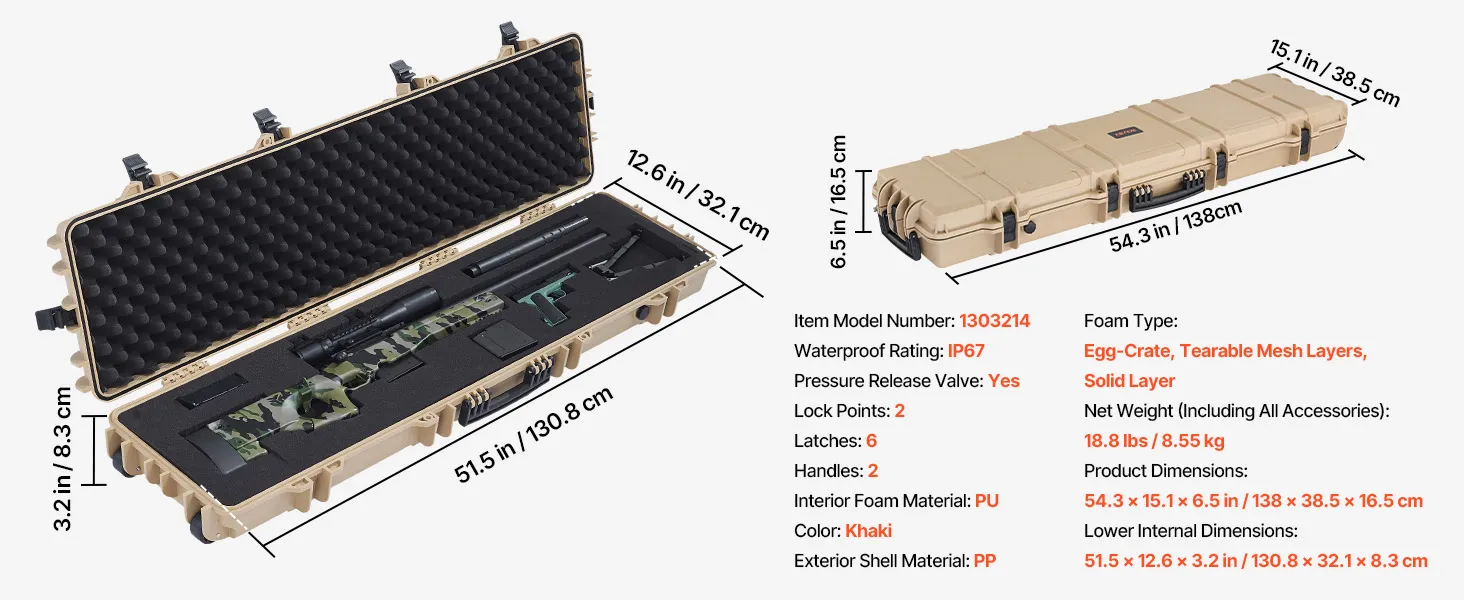 VEVOR Hard Rifle Case, Lockable Rifle Case with Pre-cut Foams, 1270 mm Movable Gun Storage with Wheels, IP67 Waterproof & Dustproof Pistol Storage for Rifle, Shotgun, Airsoft Gun, Khaki