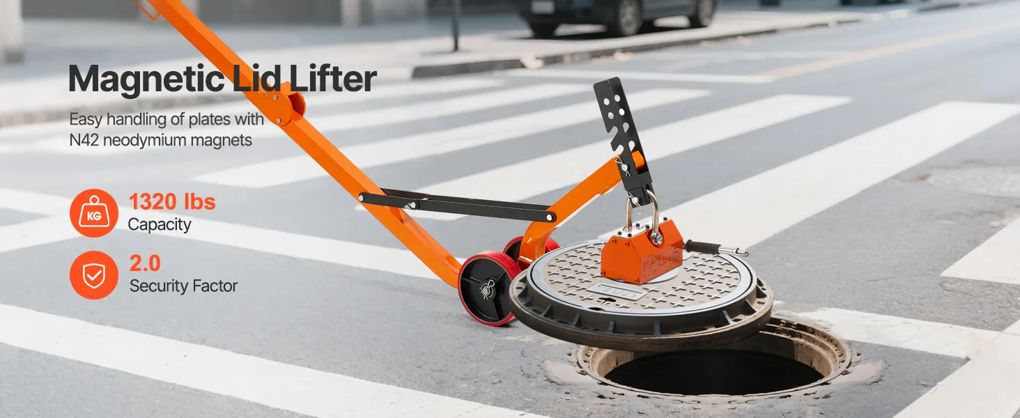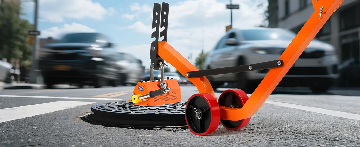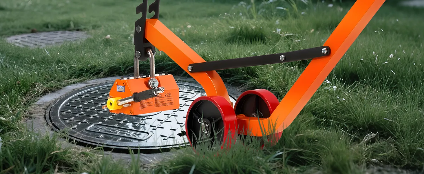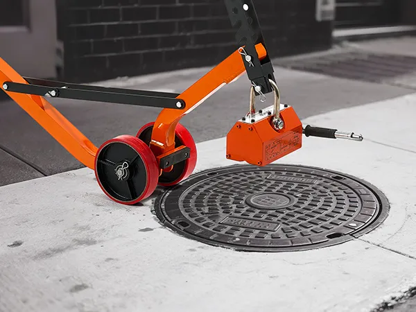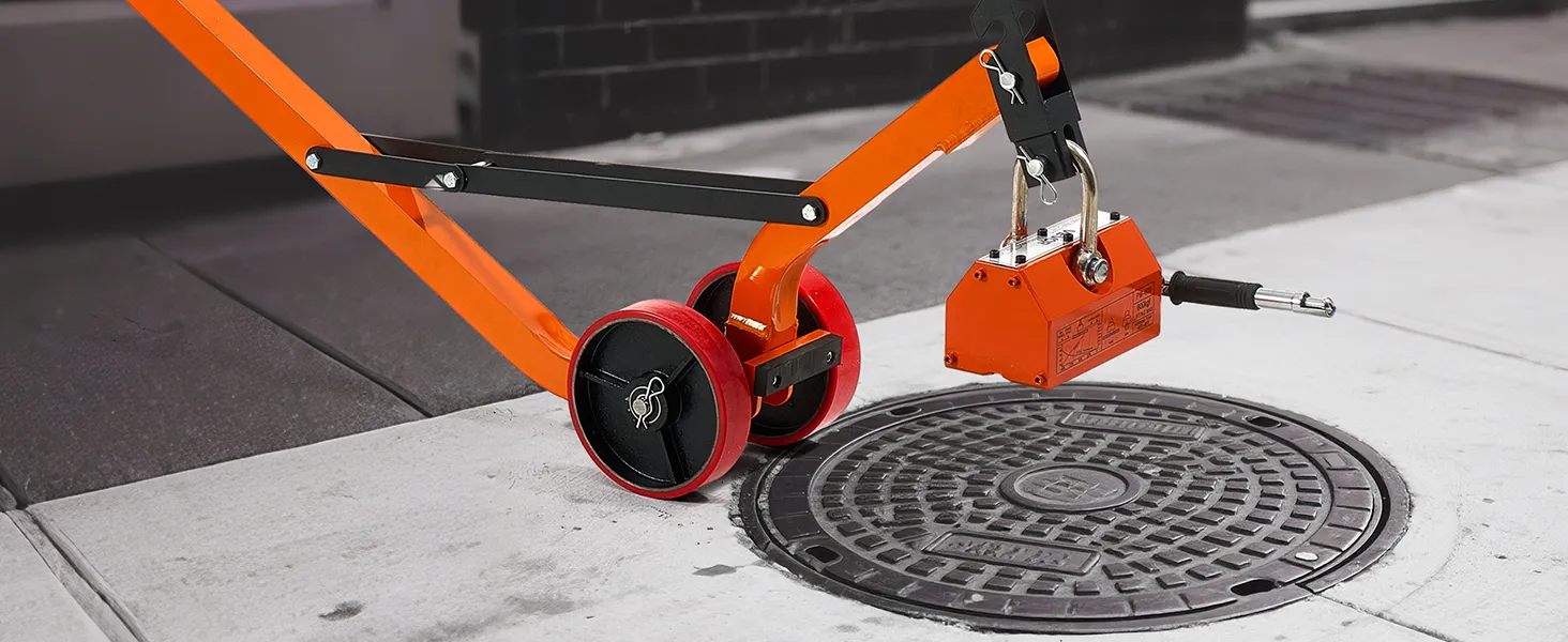 The steel dolly with magnet lift is designed with a foldable structure for convenient transport and compact storage. The 1320 lbs magnetic force ensures a firm grip and efficient lifting of various manhole lids with ease.