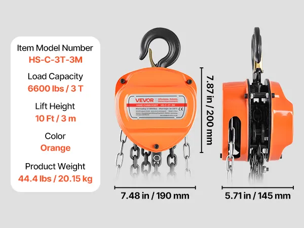 VEVOR Hand Chain Hoist, 3 Ton Capacity, Manual Chain Block with Upgrade G80 Galvanized Chain, 3 m Lifting Height, Heavy Duty Pulley Hoist for Garage Warehouse Automotive Machinery, Orange
