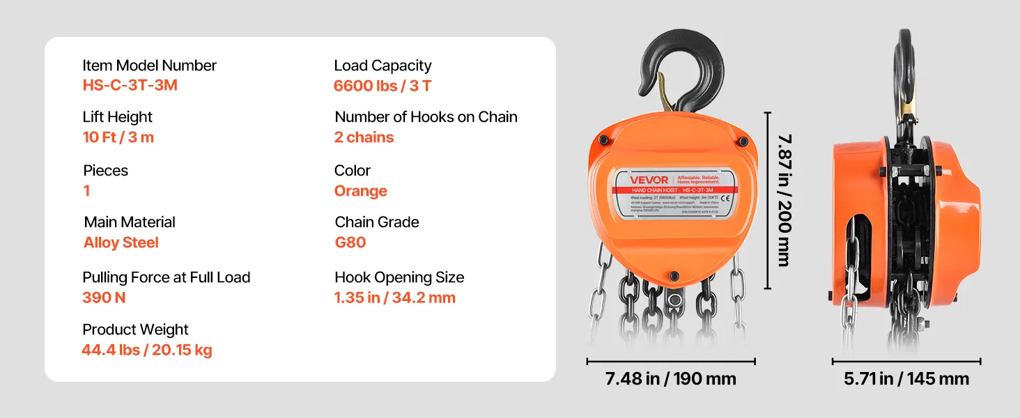 Lift heavy items with ease! Our hand chain hoist has a 6600 lbs (3T) capacity, saving you effort while ensuring smooth and secure operation every time.