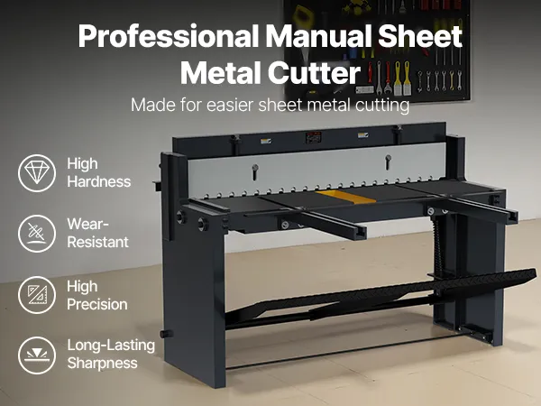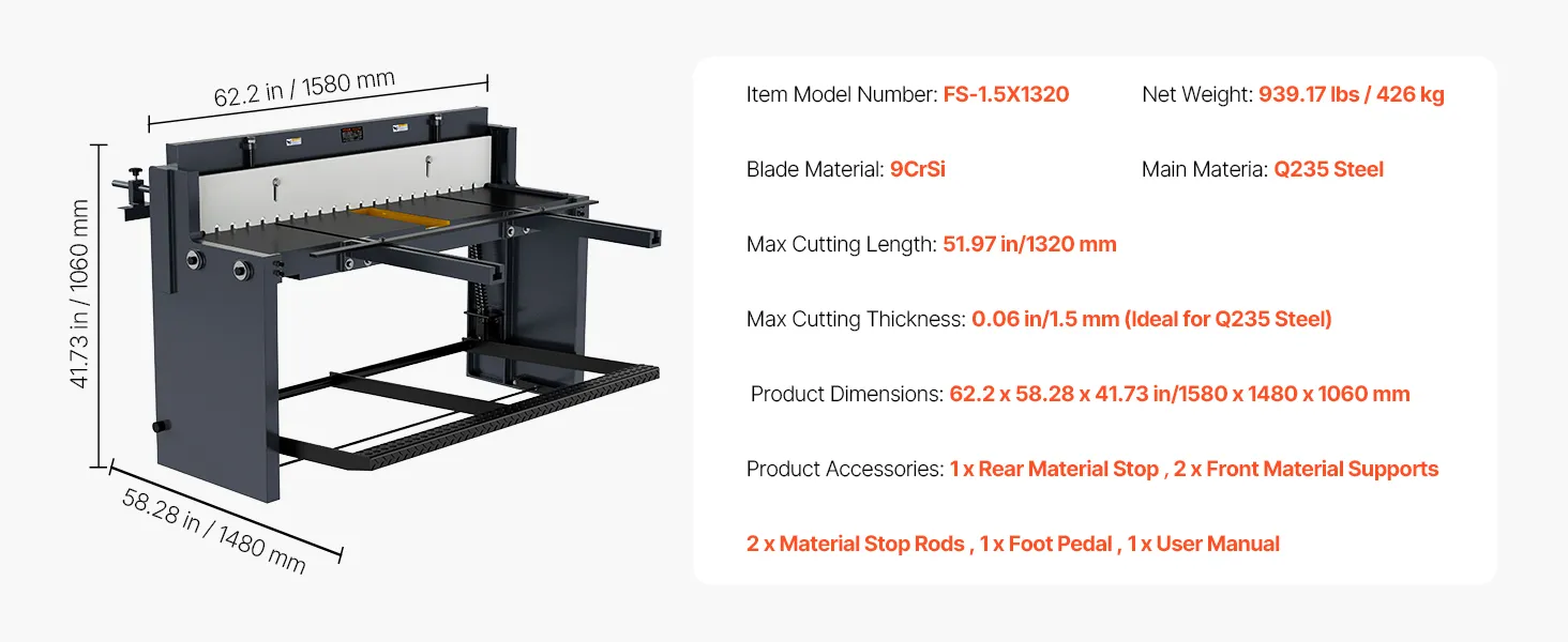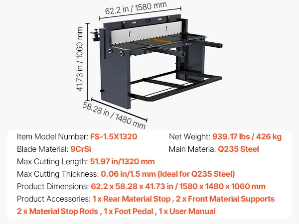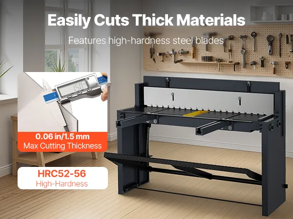 This sheet metal shear is ideal for cutting aluminum, stainless steel, and low-carbon steel. It features 9CrSi blades and a round blade, with a max cutting length of 51.97 in, thickness of 0.06 in, and a round steel capacity of 0.05 in. A <0.07 mm gap (adjustable) ensures precise, burr-free cuts.