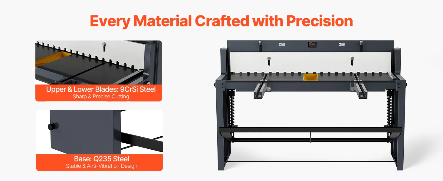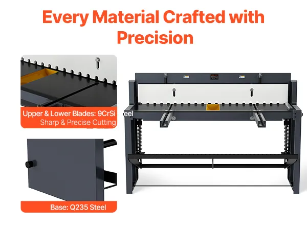 Our cutter is made with 9CrSi steel upper and lower blades and a 9CrSi round blade, all heat-treated to HRC52–54 for sharpness. It's built to be tough and edge rolling-resistant. The Q235 steel frame and base provides stable support, reducing vibration and ensuring clean, precise cuts every time.