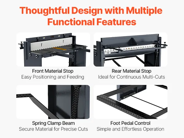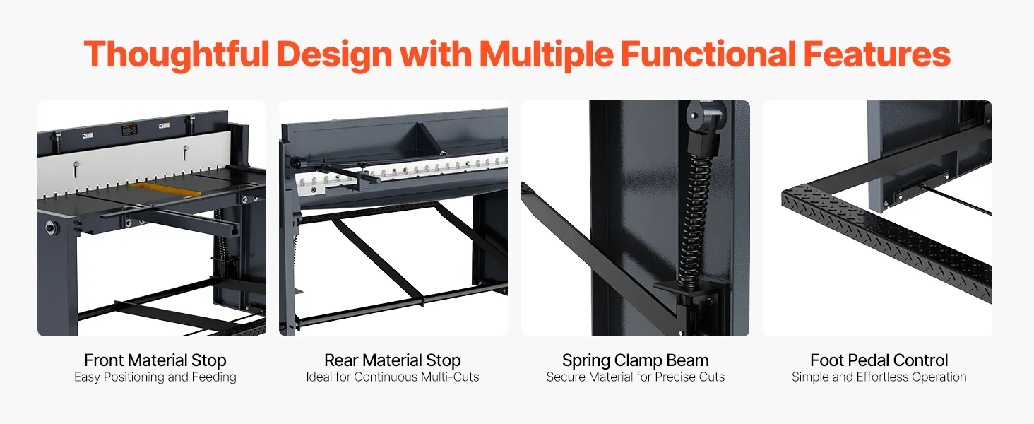 Our metal shear features foot pedal control for a more reliable and efficient operation. The front and rear material stops ensure precise material positioning and support multiple cuts. The spring-activated hold-down clamp beam securely holds materials, making it easier for everyday use.
