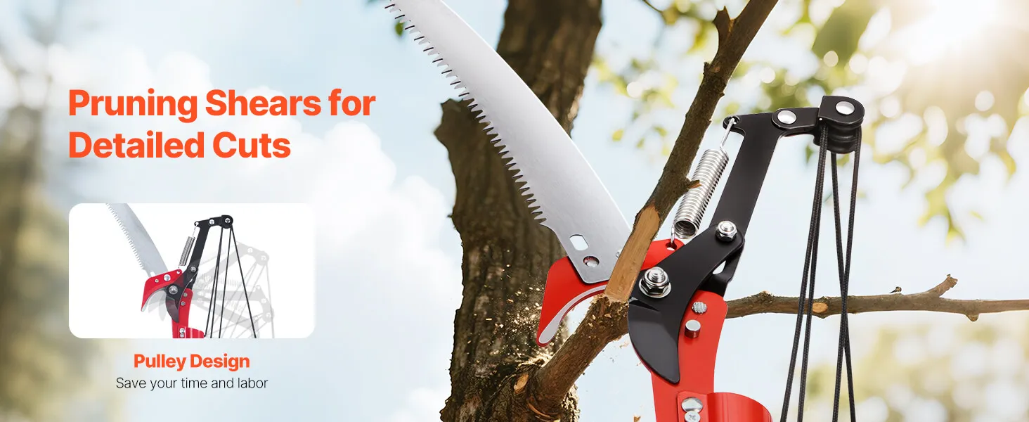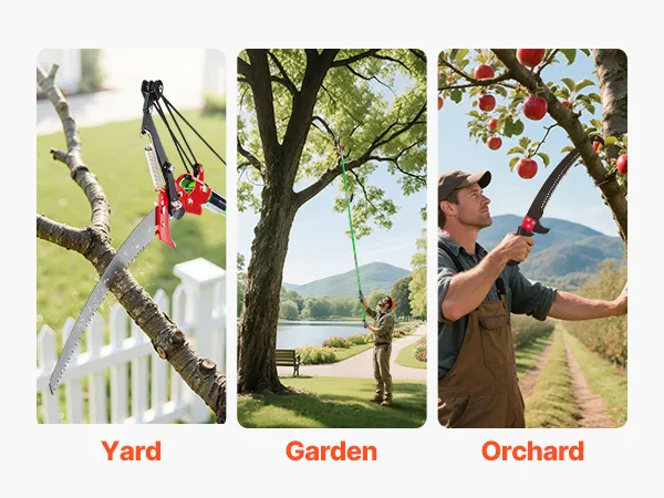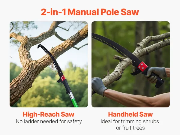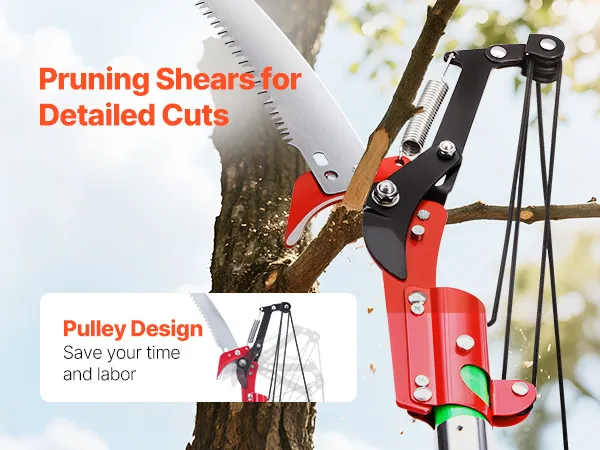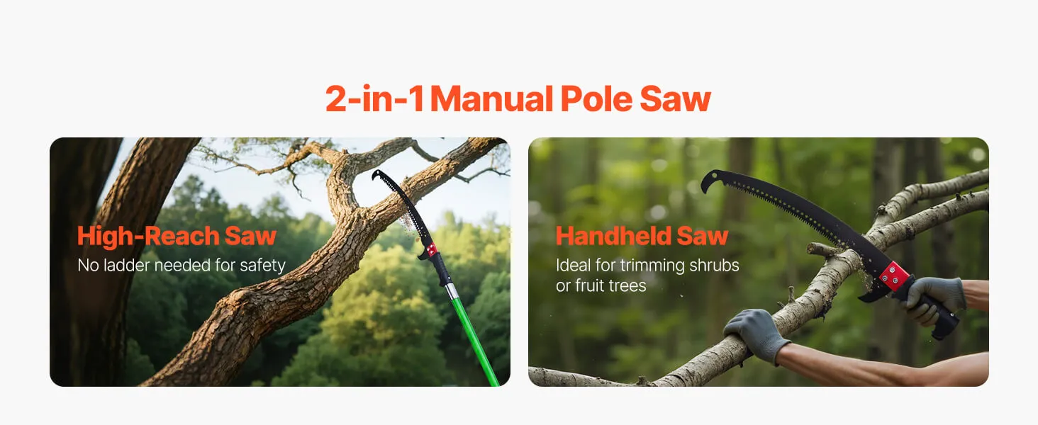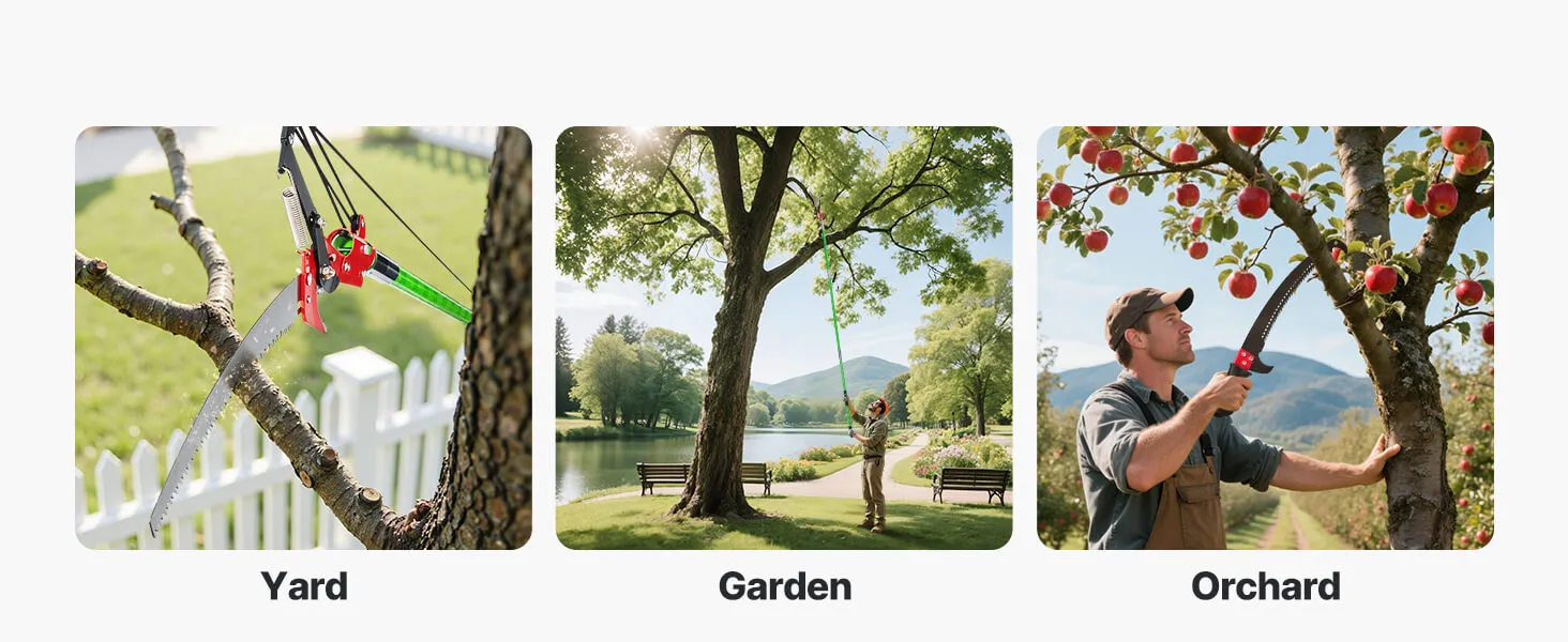 Q1: Can I trim high branches?A1: Yes, this manual pole saw can trim branches up to 27ft. For easy assembly, start with the first pole angled against the tree, then add additional sections.Q2: Is it comfortable to use for long periods?A2: Weighing only 15.65 lbs, this pole tree pruner reduces strain. For extended use, we recommend wearing back support.Q3: Can it cut thicker branches?A3: The dual-hook blade handles thicker branches, while the small blade is ideal for trimming thinner twigs. Use the pruning scissors for more detailed trimming.Q4: Is assembly and disassembly easy?A4: Assembly and disassembly are simple with a screw connection, and the included storage bag makes it easy to store.