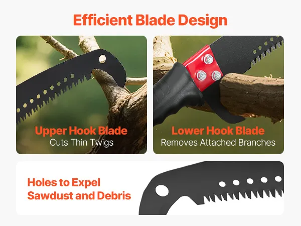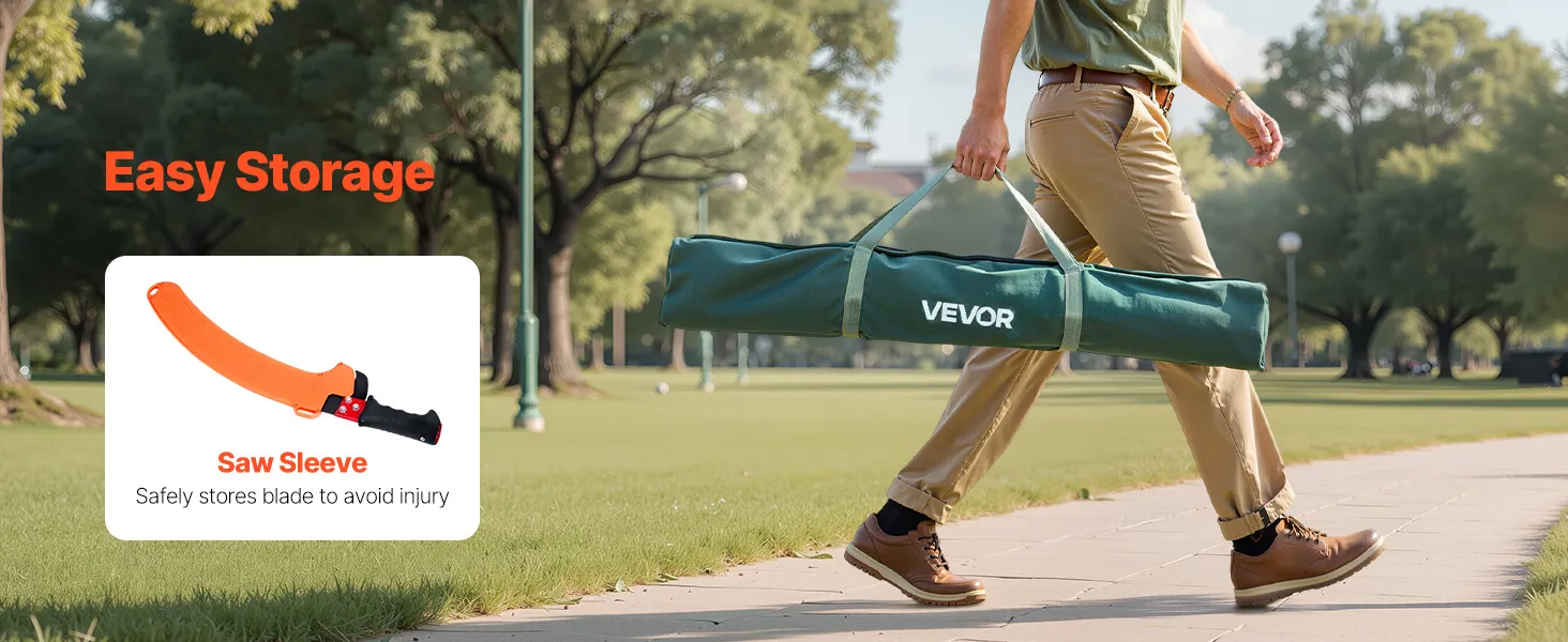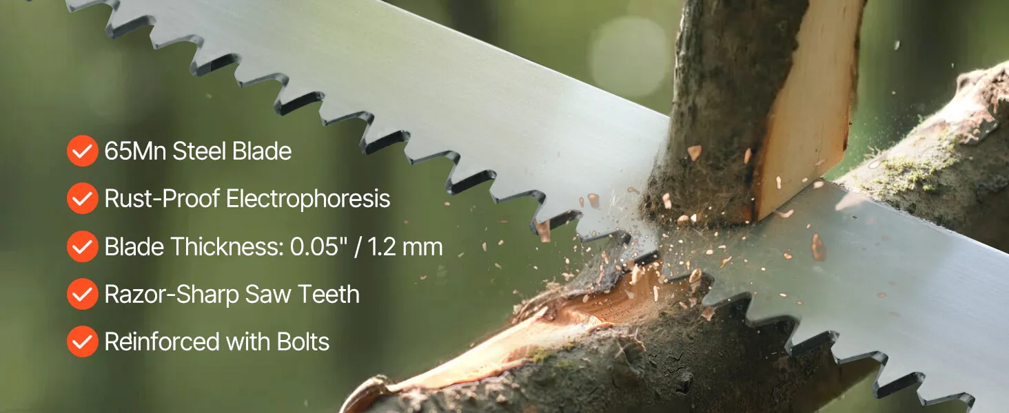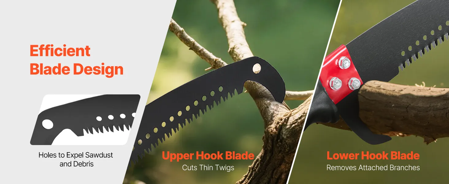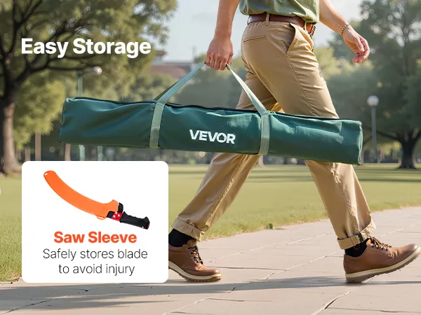 Q1: Can I trim high branches?A1: Yes, this manual pole saw can trim branches up to 27ft. For easy assembly, start with the first pole angled against the tree, then add additional sections.Q2: Is it comfortable to use for long periods?A2: Weighing only 15.65 lbs, this pole tree pruner reduces strain. For extended use, we recommend wearing back support.Q3: Can it cut thicker branches?A3: The dual-hook blade handles thicker branches, while the small blade is ideal for trimming thinner twigs. Use the pruning scissors for more detailed trimming.Q4: Is assembly and disassembly easy?A4: Assembly and disassembly are simple with a screw connection, and the included storage bag makes it easy to store.