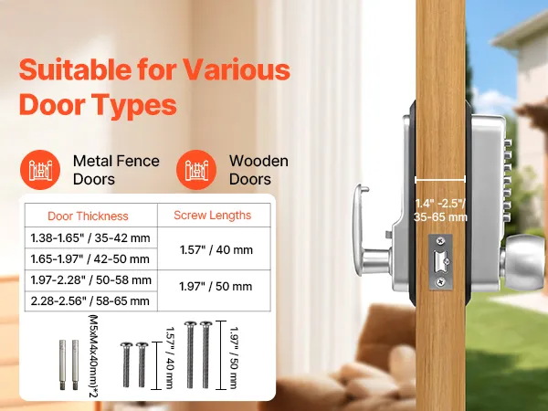 This mechanical keyless door lock is compatible with metal fence doors, wooden doors, and a range of standard door thicknesses. It includes multiple shafts and screws to accommodate different installation needs.