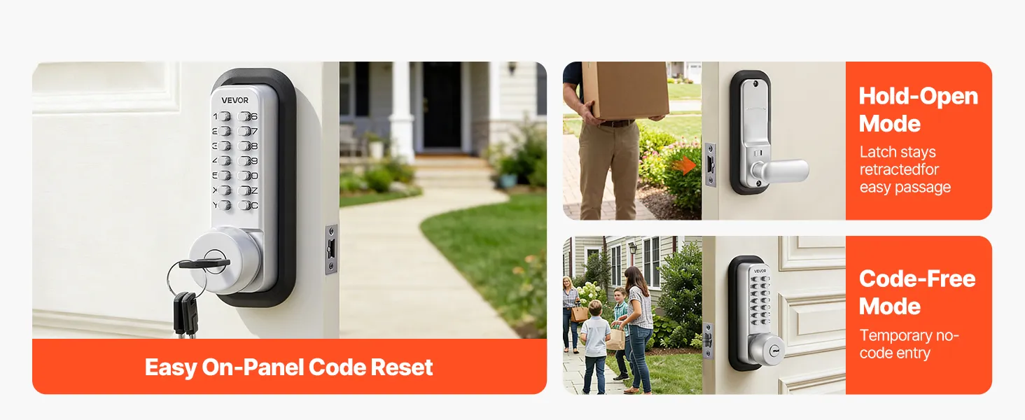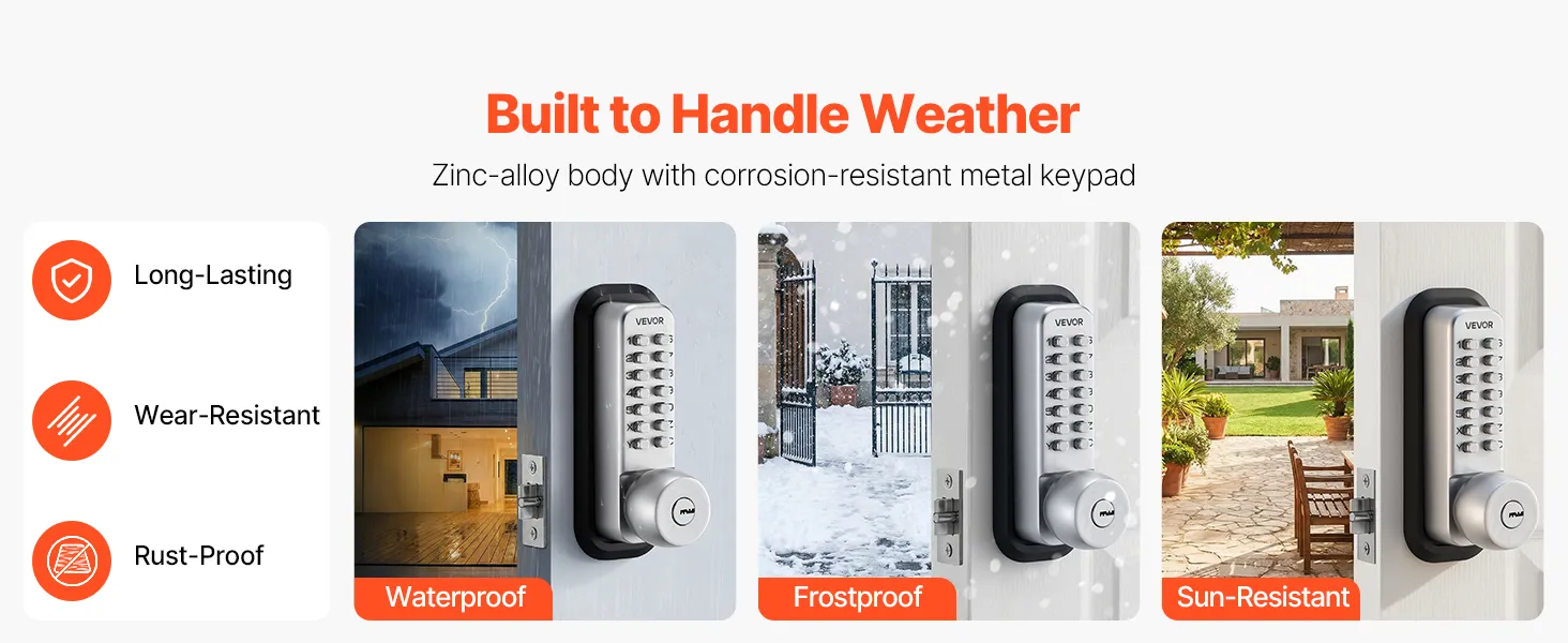 With a fully mechanical keypad, all-metal construction, and multiple convenient modes, the mechanical keyless entry door lock delivers reliable everyday security without wiring, apps, or maintenance. Designed for both indoor and outdoor use, it provides smooth operation and long-lasting performance.