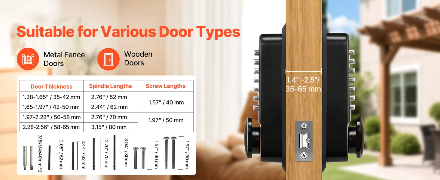 This mechanical keyless door lock is compatible with metal fence doors, wooden doors, and a range of standard door thicknesses. It includes multiple shafts and screws to accommodate different installation needs.