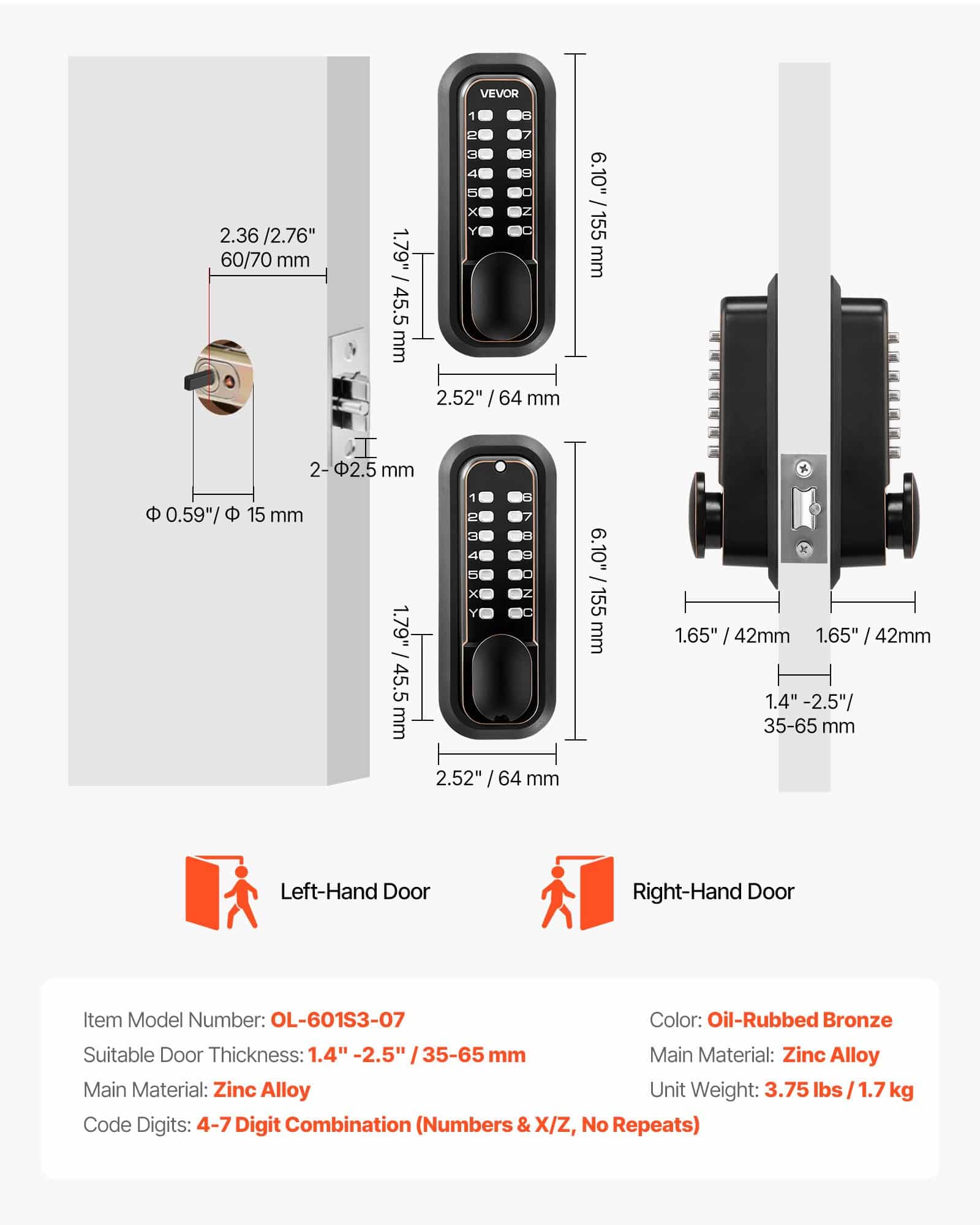 VEVOR Mechanical Keyless Entry Door Lock, 2.0 Code Upgrade, 4-7 Digits Code, Double-Sided Push Button Combination Mechanical Keypad Door Knob, Auto Locking, for Indoor or Outdoor, Oil-Rubbed Bronze