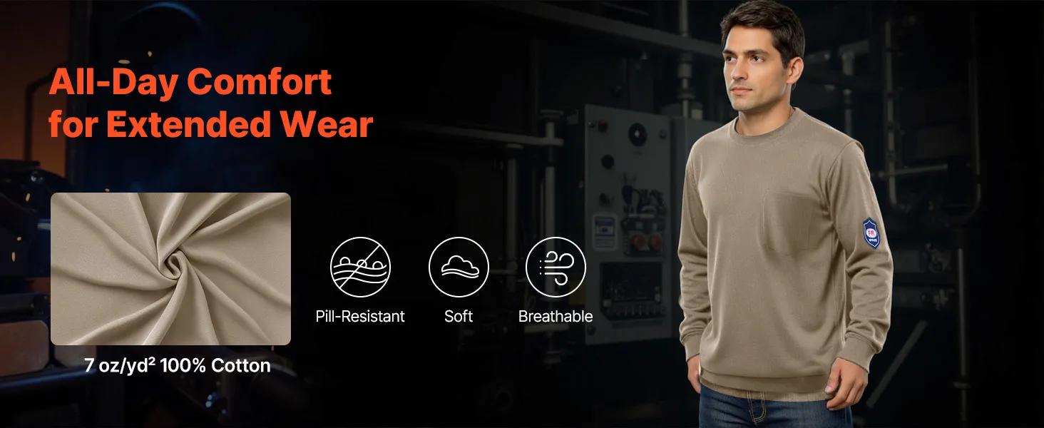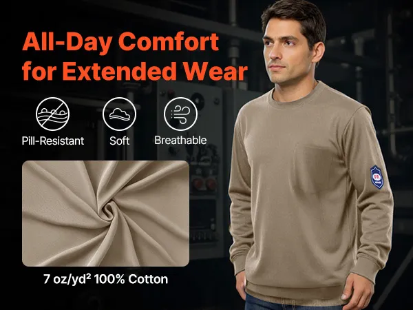 The classic crew neck offers a non-restrictive fit around the neck. A chest pocket provides quick access to ID badges, pens, or small tools. Flame-resistant labeling ensures industry compliance, while the clean cuff design avoids sagging.