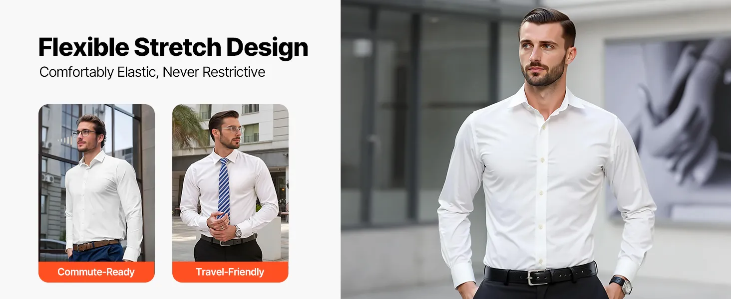 With a polyester-spandex blend, this men button up shirt is wrinkle-free and maintains its crisp shape. Just shake it out after washing—no ironing needed—making it a time-saving choice for business trips, commuting, or travel.