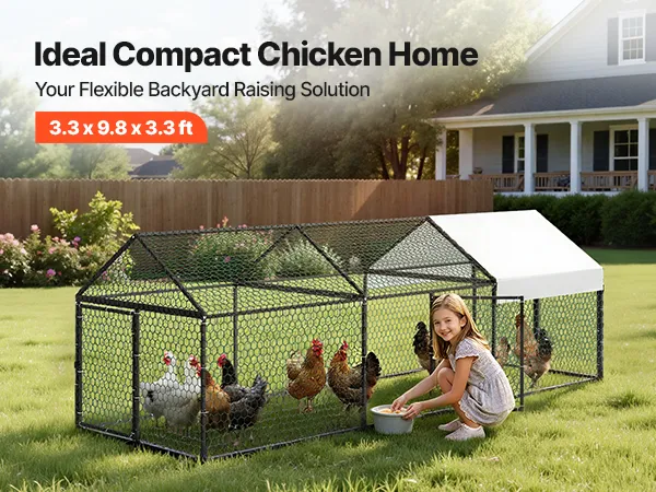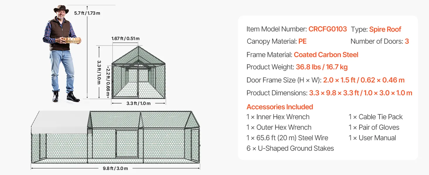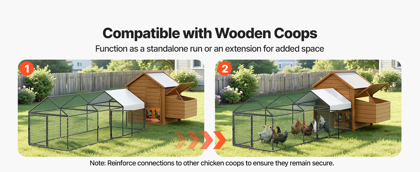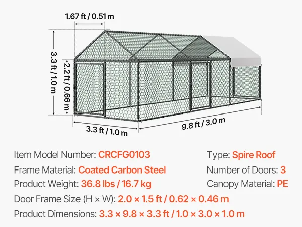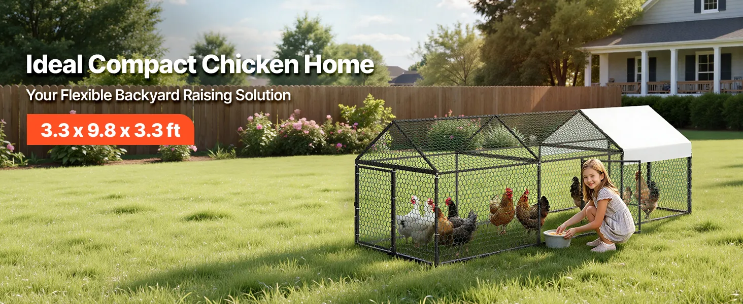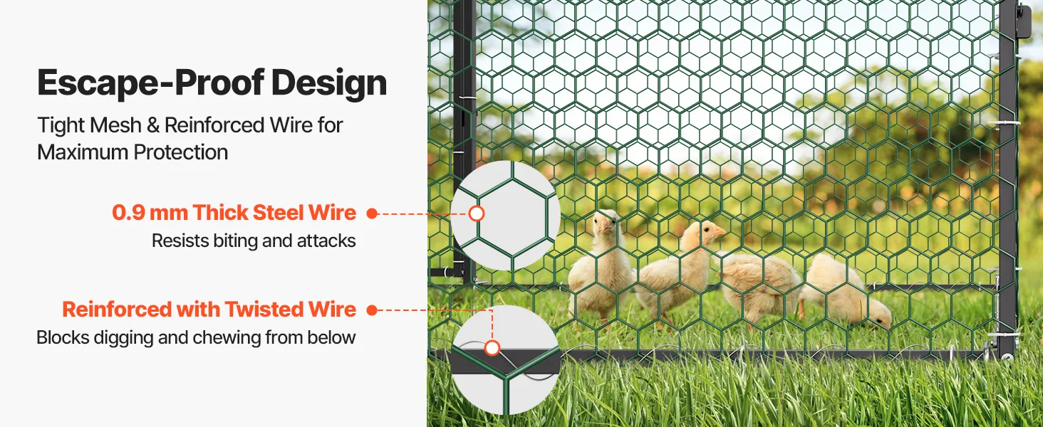 VEVOR Metal Chicken Coop for 6-8 Chickens, 1 x 3 x 1 m, Small Chicken Cage with Waterproof Cover & 3 Doors, Spire Roof Poultry Run Compatible with Wooden Coops, for Rabbit Hen Goose Duck
