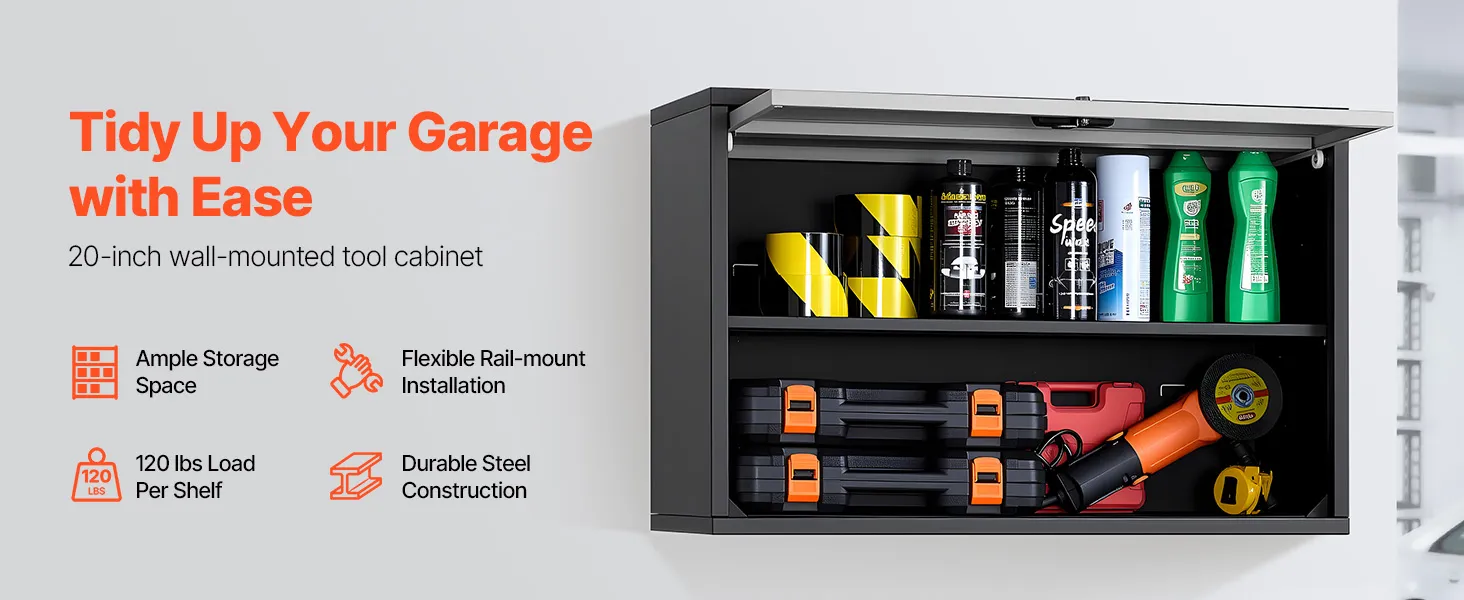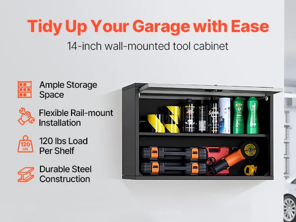 Store more with this sturdy steel wall cabinet! Each shelf holds up to 120 lbs, and the hanging rail makes setup quick. Great for keeping your garage neat and clutter-free.