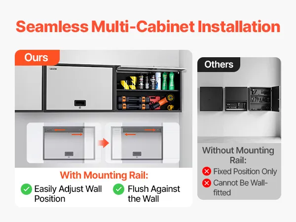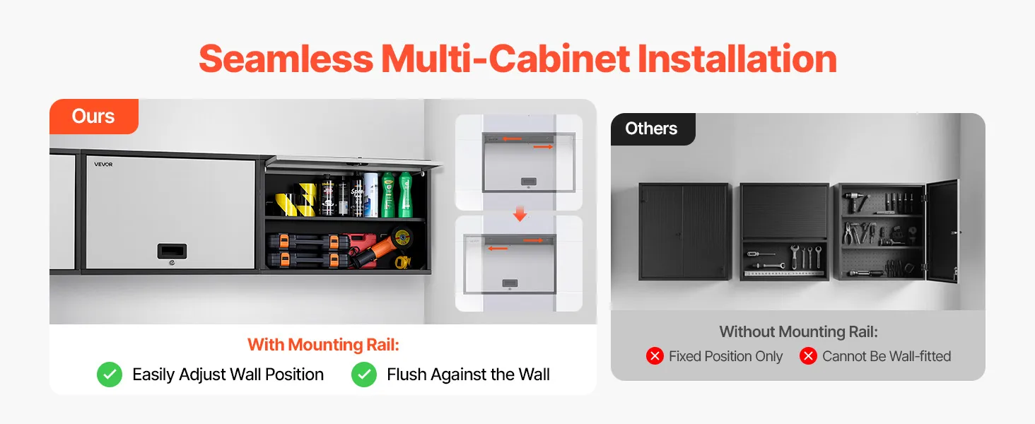 The smart hanging rail of the wall-mounted garage cabinet lets you mount it flush to concrete or wood walls. Get a seamless, polished look with rock-solid stability.
