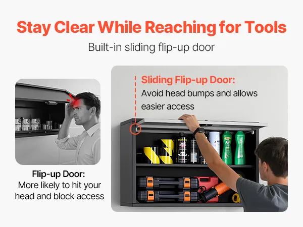 The 90° recessed flip-up door of the locking wall cabinet slides upward for access, so you won’t bump your head. Smooth, secure, and hassle-free every time.