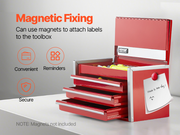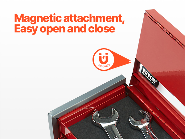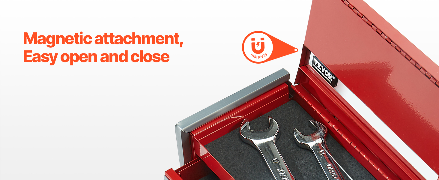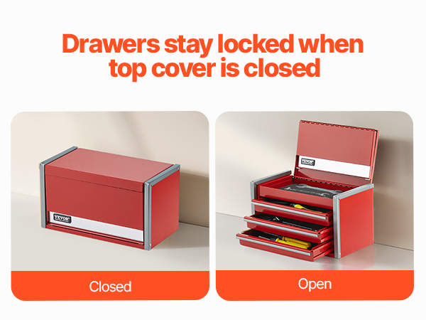 • Удобное открывание и закрывание: Верхняя крышка имеет конструкцию с магнитным замком. Просто закройте верхнюю крышку, чтобы надежно зафиксировать ящик для инструментов, гарантируя, что ящики случайно не выдвинутся во время перемещения, и избегая падения предметов. Гладкие выдвижные ящики обеспечивают легкий доступ без каких-либо заеданий, обеспечивая плавное и стабильное открывание.