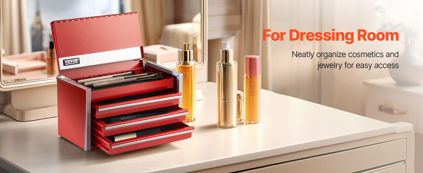 VEVOR Компактный Металлический Ящик для Инструментов с 3 Ящиками, Стальной Корпус с EVA Вставками и Нескользящими Ножками, 22 см, Красный