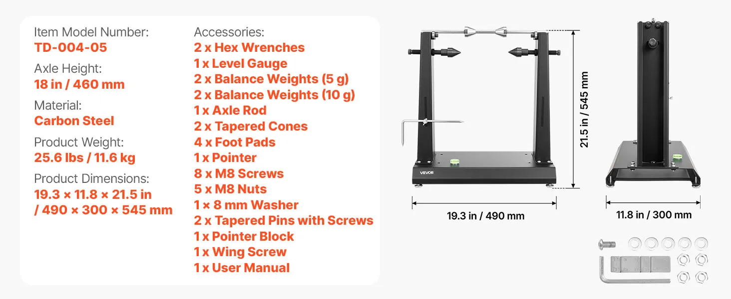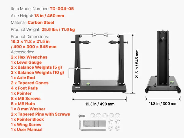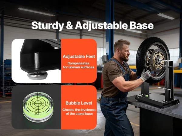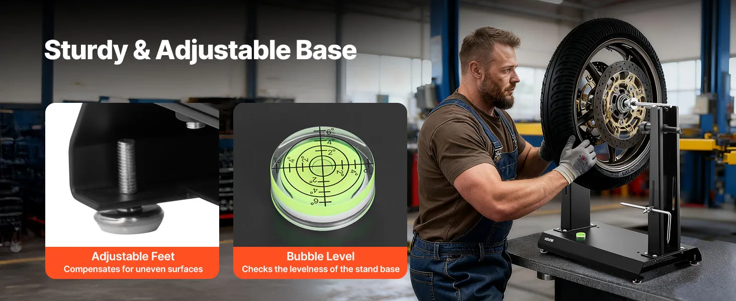 Built with heavy-duty carbon steel, this tire balancer stand features four adjustable leveling feet for a stable base. A bubble level helps check alignment so you get professional-grade results every time.