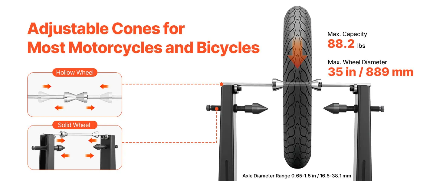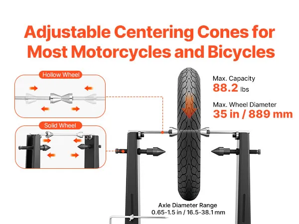 Our motorcycle wheel balance stand includes two adjustable centering cones, supporting both solid and hollow axles. It covers nearly all motorcycle and bicycle wheel types for versatile use.