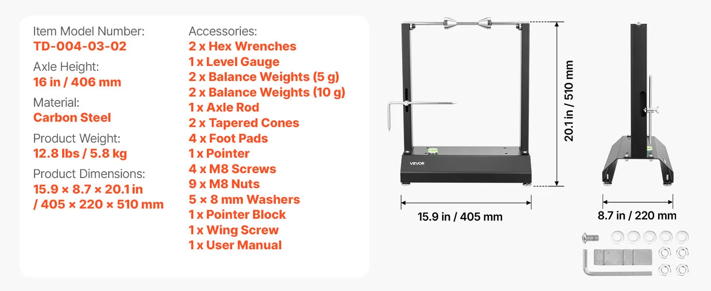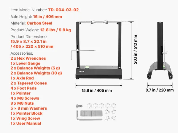 • Practical Accessories: The motorcycle bike wheel balancer comes with two sets of 5 g and 10 g weights for fine adjustments. Four adjustable foot pads and a bubble level keep the stand level on uneven ground. A wrench is included for easy frame assembly