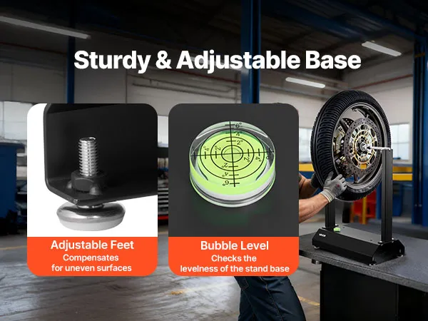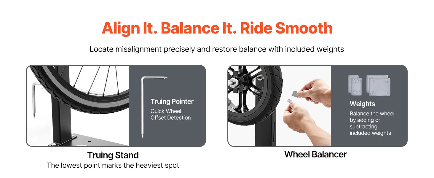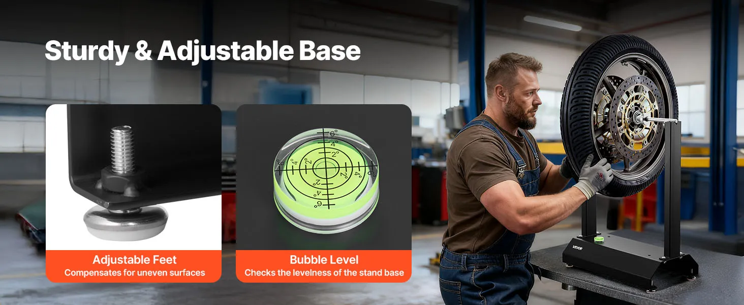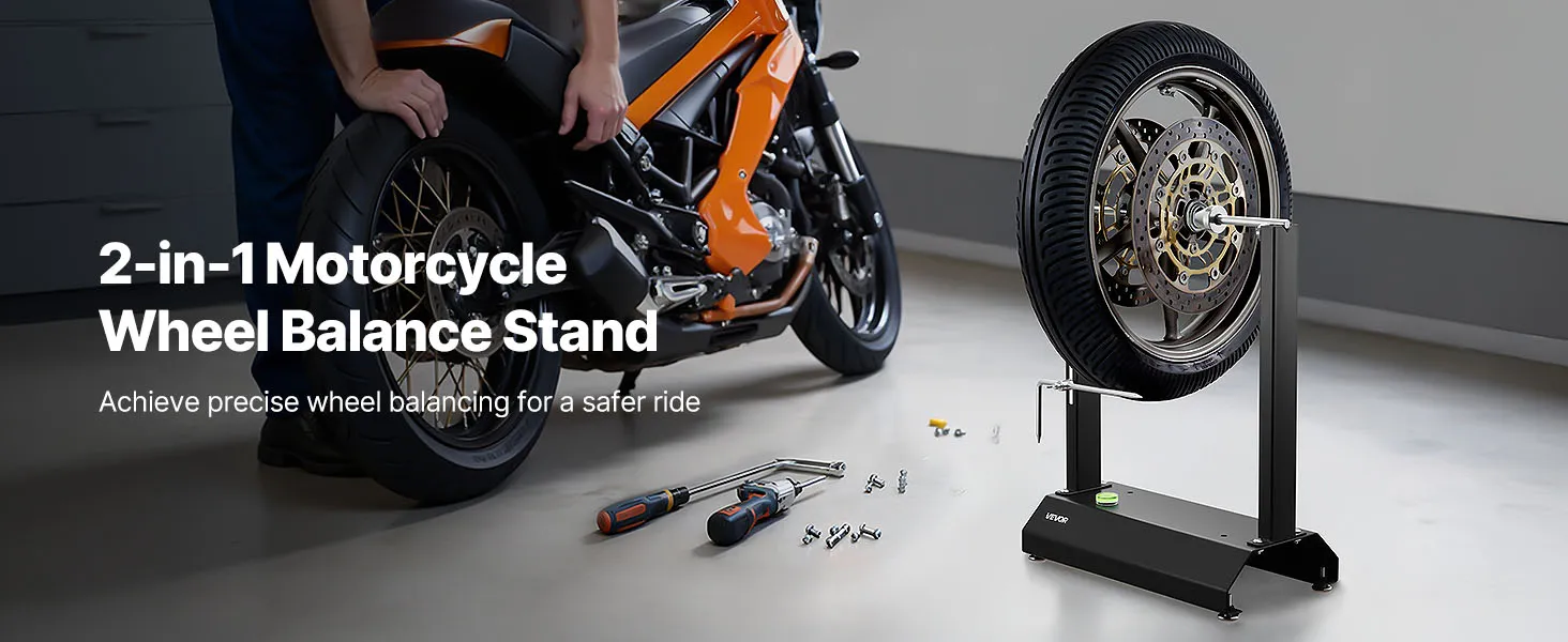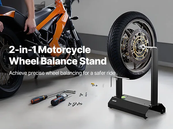 • Wheel Balancer & Truing Stand: This motorcycle wheel balancer helps identify the heaviest wheel point and correct imbalance with weights on the opposite rim side. It evenly distributes mass, reducing high-speed vibration and delivering a smoother ride