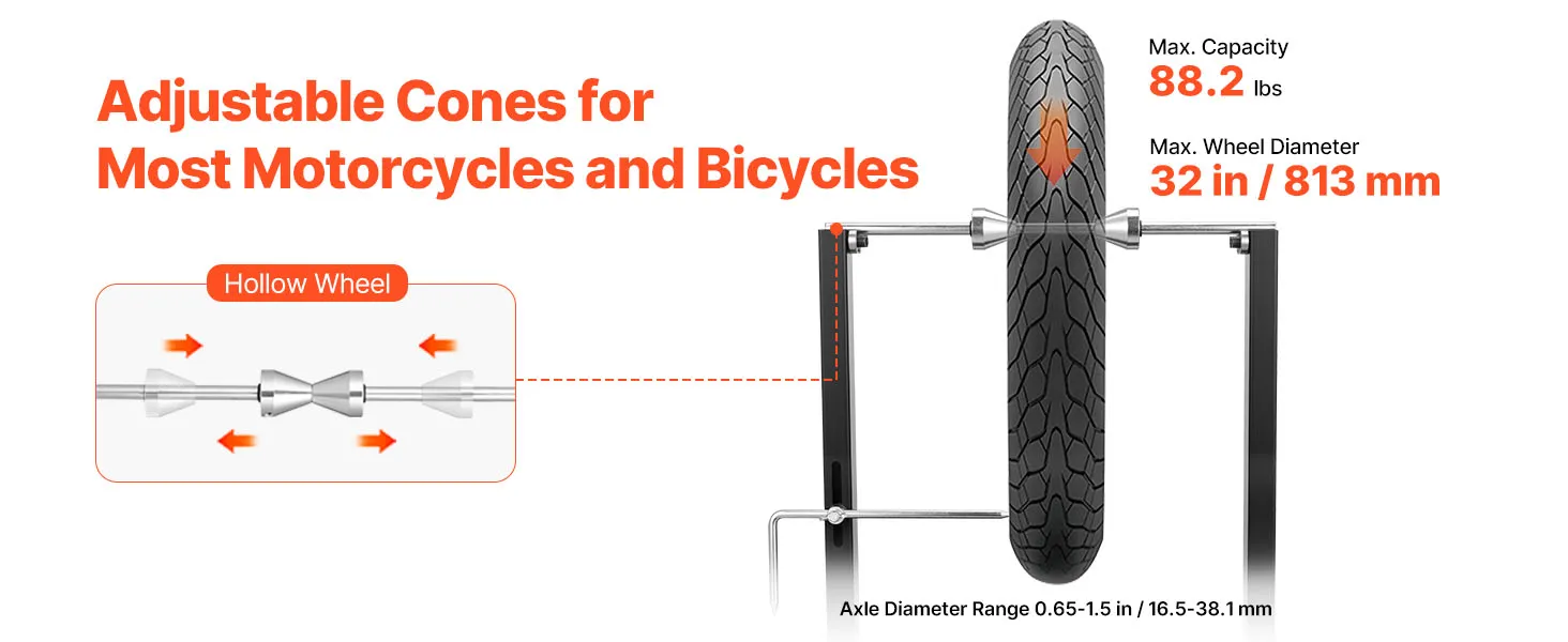 • Fits Hollow Wheels: Our motorcycle bicycle wheel balancer works with most hollow motorcycle and bicycle wheels. It accommodates axle diameters from 0.65-1.5 in, wheel sizes up to 32 in, and supports loads up to 88.2 lbs