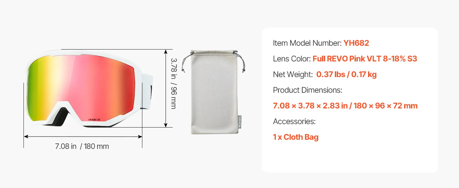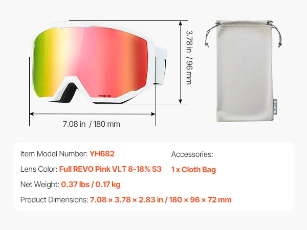 VEVOR Ski Goggles, Cylindrical Lens with Pink Revo Coating, OTG Anti fog Snow Goggles for Men Women Youth, TPU Frame & Ventilation Structure, Suitable for Skiing, Skating, Snowboarding, Cycling