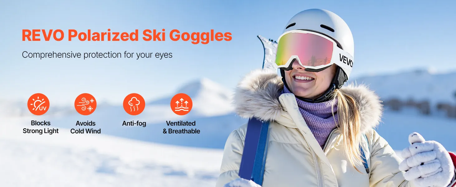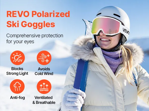 These Revo ski goggles block harsh sunlight and reduce snow glare to help prevent snow blindness. They shield you from cold wind, keep your view fog-free, and maintain fresh airflow so you can enjoy every run with confidence.