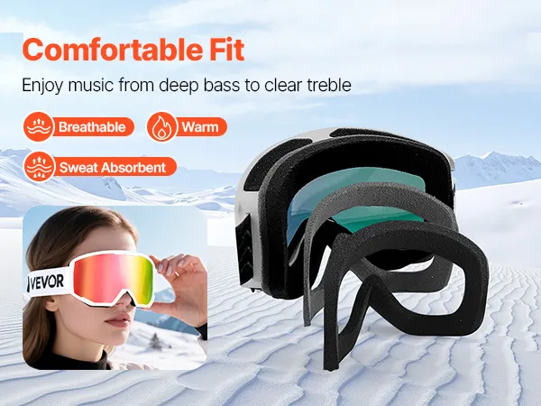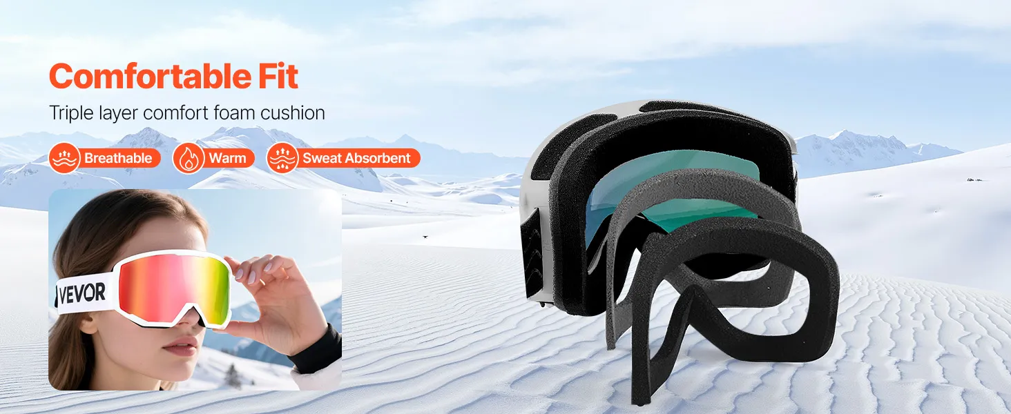 Soft triple-layer foam of the snowboard goggles gently contours to your face, absorbing shock and blocking cold air. The breathable, moisture-wicking design keeps you warm, sweat-free, and comfortable for all-day skiing.