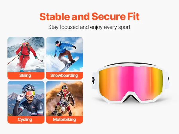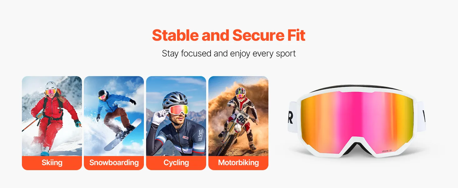The snug fit hugs your face shape, so the skiing goggles stay in place even during intense activity. Clear, fog-free vision keeps you focused whether you’re skiing, snowboarding, or cycling.