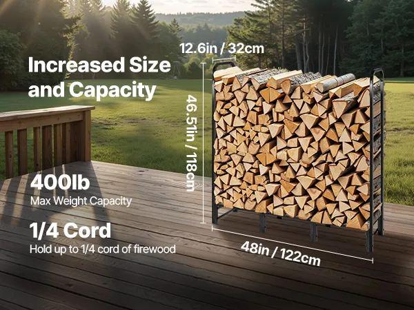 • Ample Storage Capacity: Measuring 48.03 × 12.60 × 46.46 in, this firewood rack offers generous space to hold up to 1/4 cord of firewood. It’s ideal for stacking and drying large amounts of wood, suitable for porches, patios, gardens, under eaves, or backyard setups.