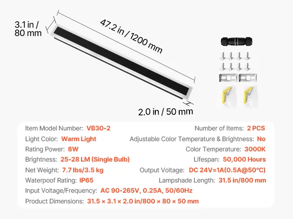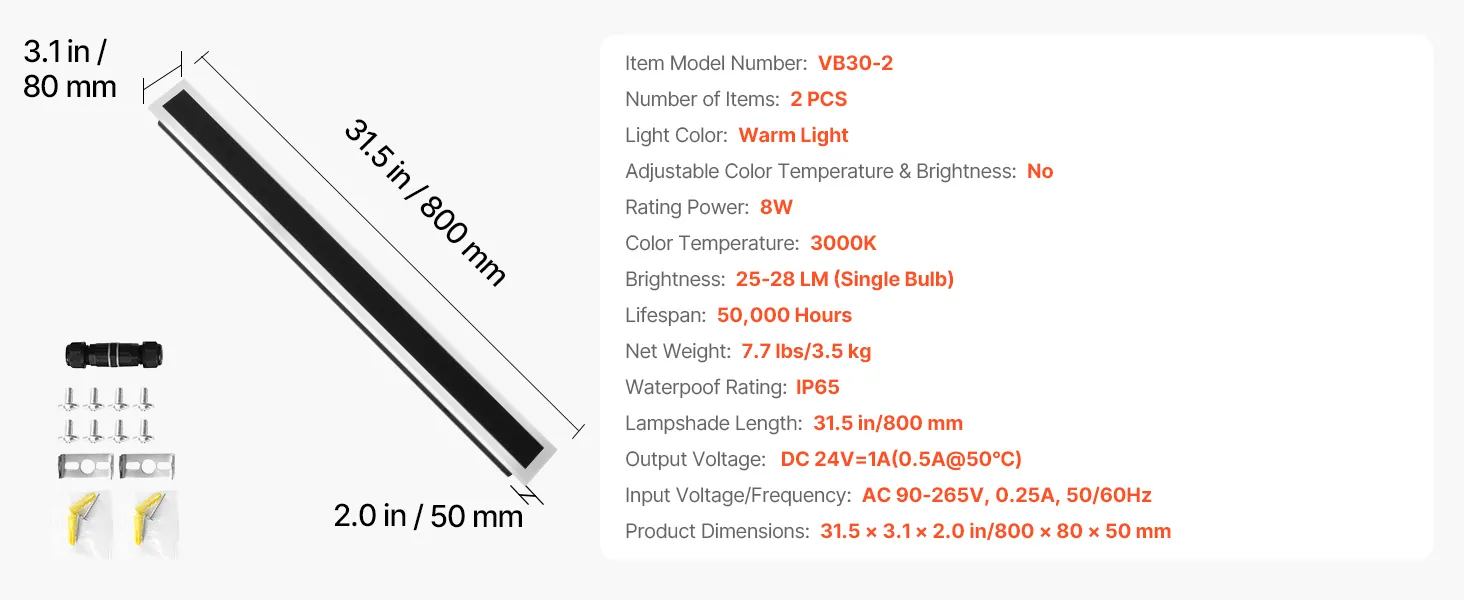 VEVOR Outdoor Wall Lights, 2 Pack, 800 mm Long Strip Modern Exterior Wall Sconce Light Fixtures, 3000K Warm White, IP65 Waterproof Anti-Rust Outside Wall Mount Lighting, for House, Porch, Garage