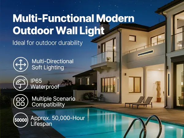 Multi-directional soft light creates ambient moods, and IP65 waterproof ensures durability. Energy-efficient outdoor wall light with extended lifespan elevates functionality and aesthetics, is ideal for gardens, entryways, and commercial facades.