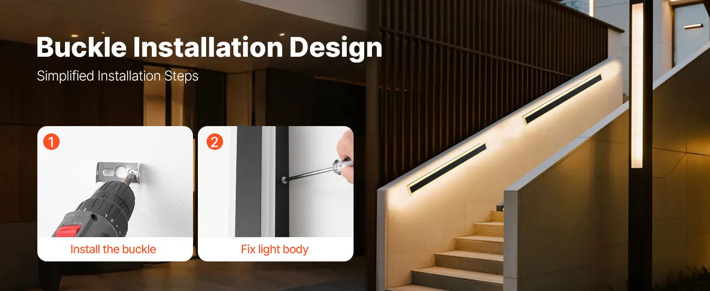 This outdoor wall sconce features pre-grooved wiring channels and buckle installation. First, organize wiring within channels, then fix the light body through the buckle. The two-step process simplifies complex operations and is suitable for various outdoor installations.
