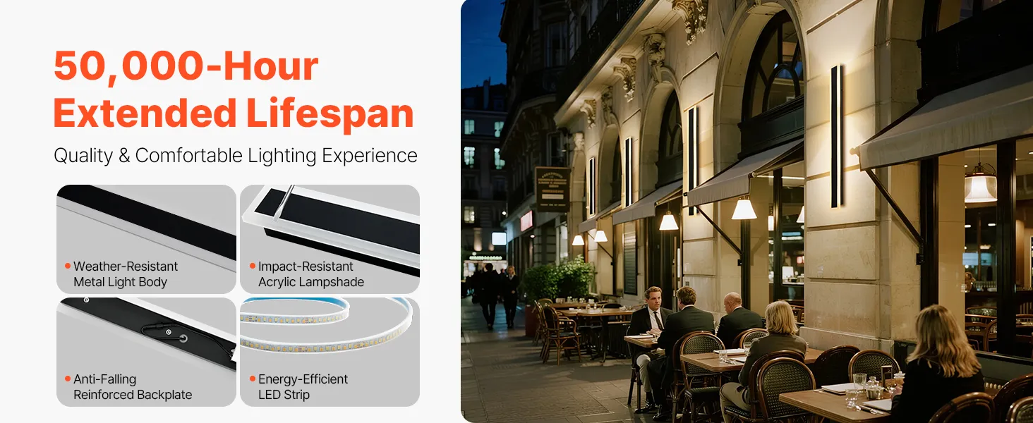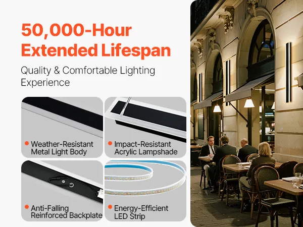 Reliable protection system with weather-resistant metal light body, impact-resistant acrylic lampshade, reinforced backplate, and energy-saving LED strips. The outdoor light fixture wall mount provides up to 50,000 hours of extended lifespan after rigorous testing.
