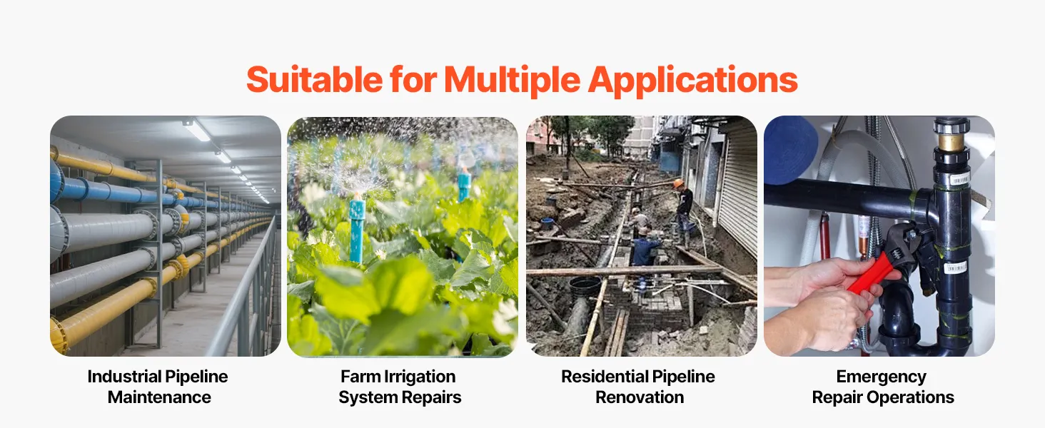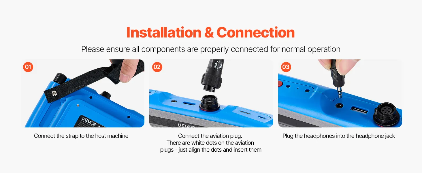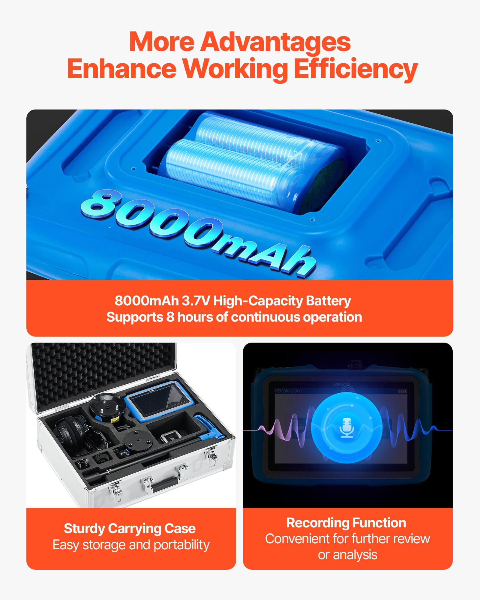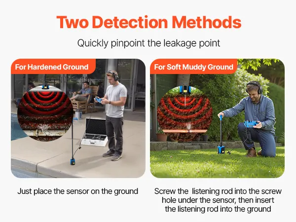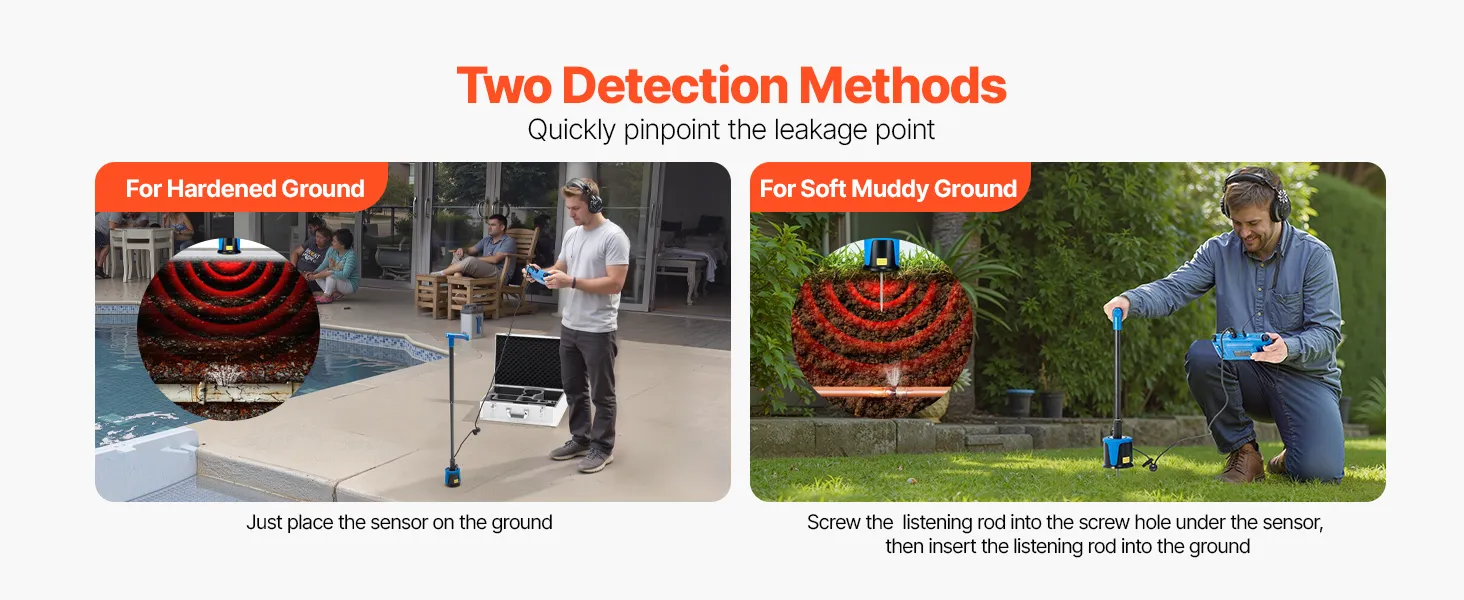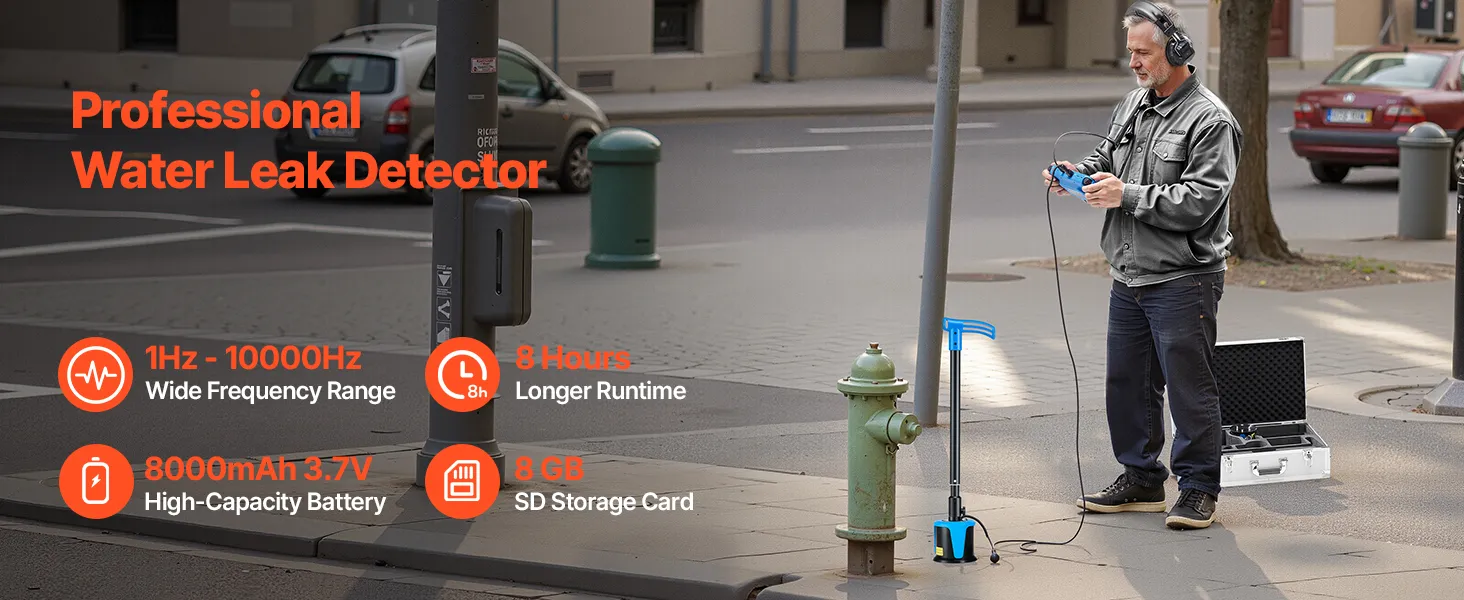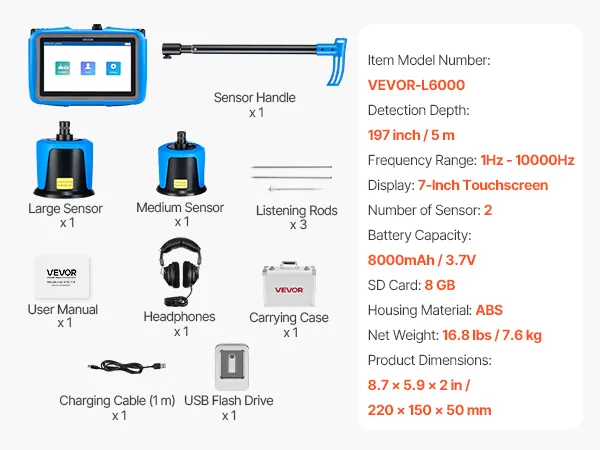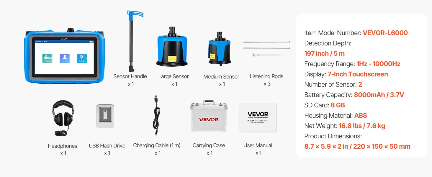 VEVOR pipe water leakage detector provides a 1Hz–10000Hz wide frequency range and 16.4FT (5m) detection depth. Equipped with medium & large sensors, 3 listening rods, noise-canceling headphones, 7-inch touchscreen and 8000 mAh high-capacity battery for efficient outdoor pipes leak detection.