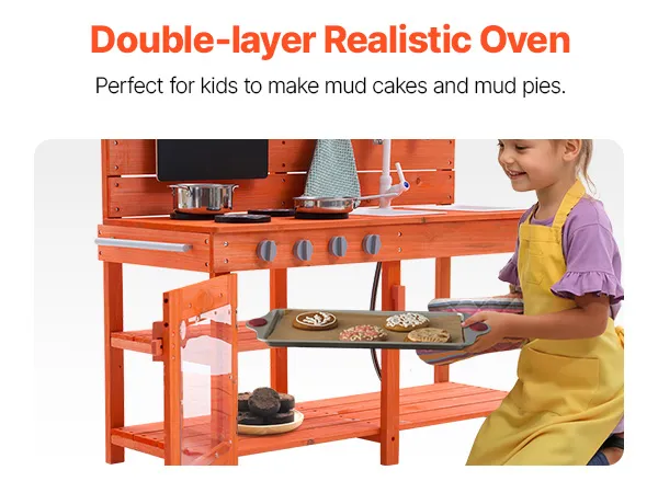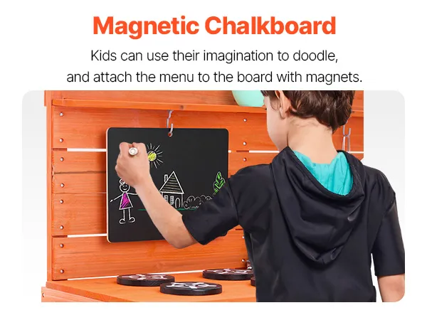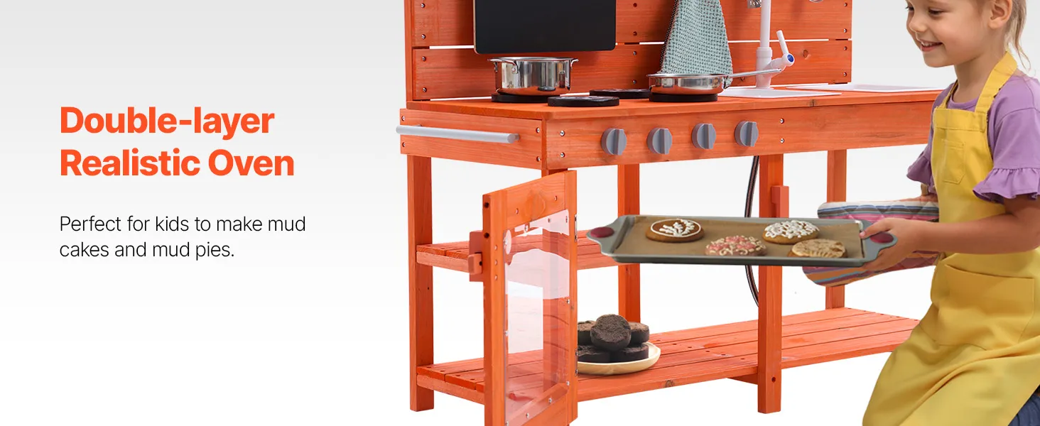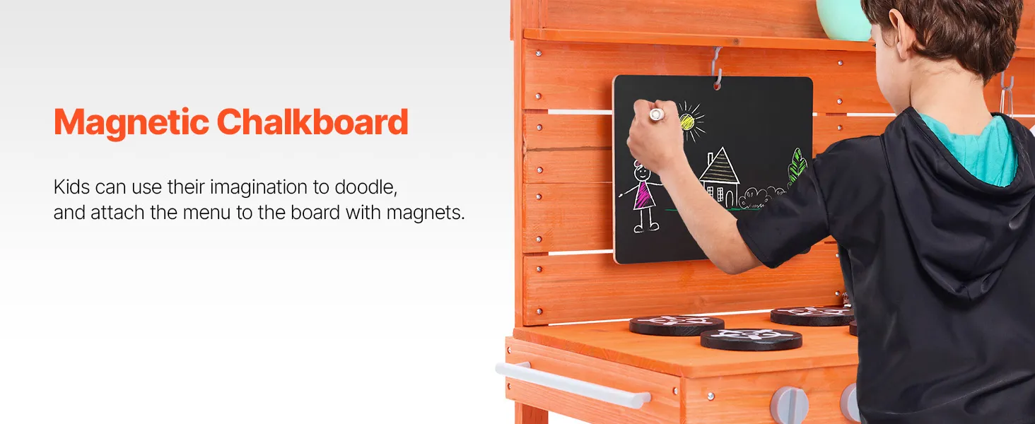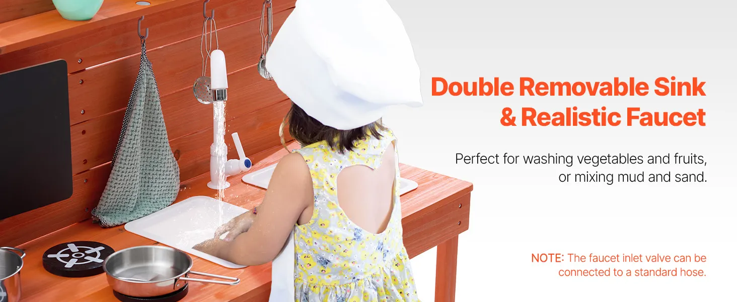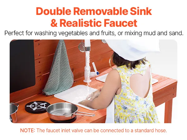 • Realistic Kitchen Play Design: Let your little one imitate cooking with dirt just like a real chef! Little chefs can write and draw menus on the magnetic chalkboard, use the two removable sinks and pull-out faucet to clean up their “dishes” (the faucet is compatible with a standard garden hose), and turn the knobs on the simulated stove to start cooking. They can even bake “mud pies” in the dual-layer oven! After play, they can easily clean the surface with the pull-out faucet