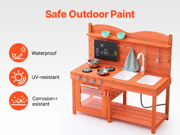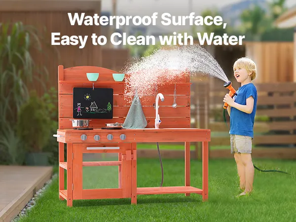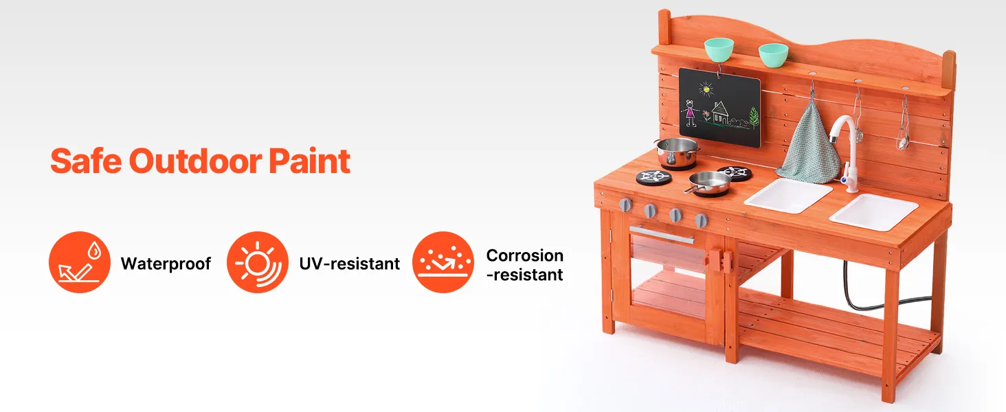 • Waterproof Surface, Perfect for Outdoor Use: The outdoor mud kitchen features a waterproof and corrosion-resistant surface, treated with outdoor-grade paint. It is built to withstand harsh weather and extreme conditions, making it perfect for outdoor use in gardens, backyards, or lawns. This kids grocery store playset market can easily handle rain and intense sunlight, ensuring durability and extending its lifespan
