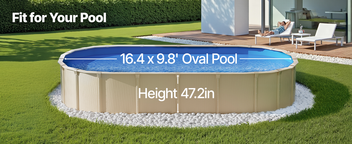 • Подходит для бассейнов размером 16,4 × 9,8 футов: Наша облицовка для бассейнов специально отмерена для овальных бассейнов размером 16,4 × 9,8 футов с плоским дном и высотой стенок до 47 дюймов, что обеспечивает точную и надежную посадку для вашего бассейна.