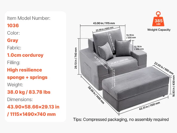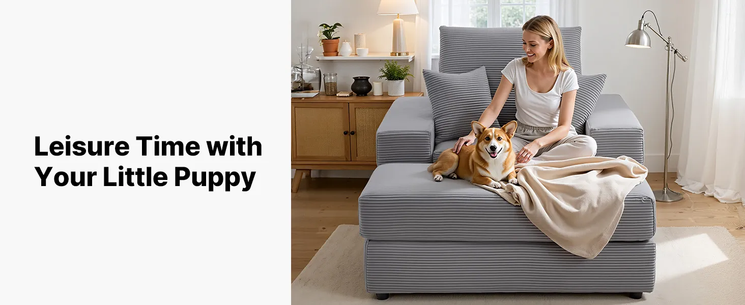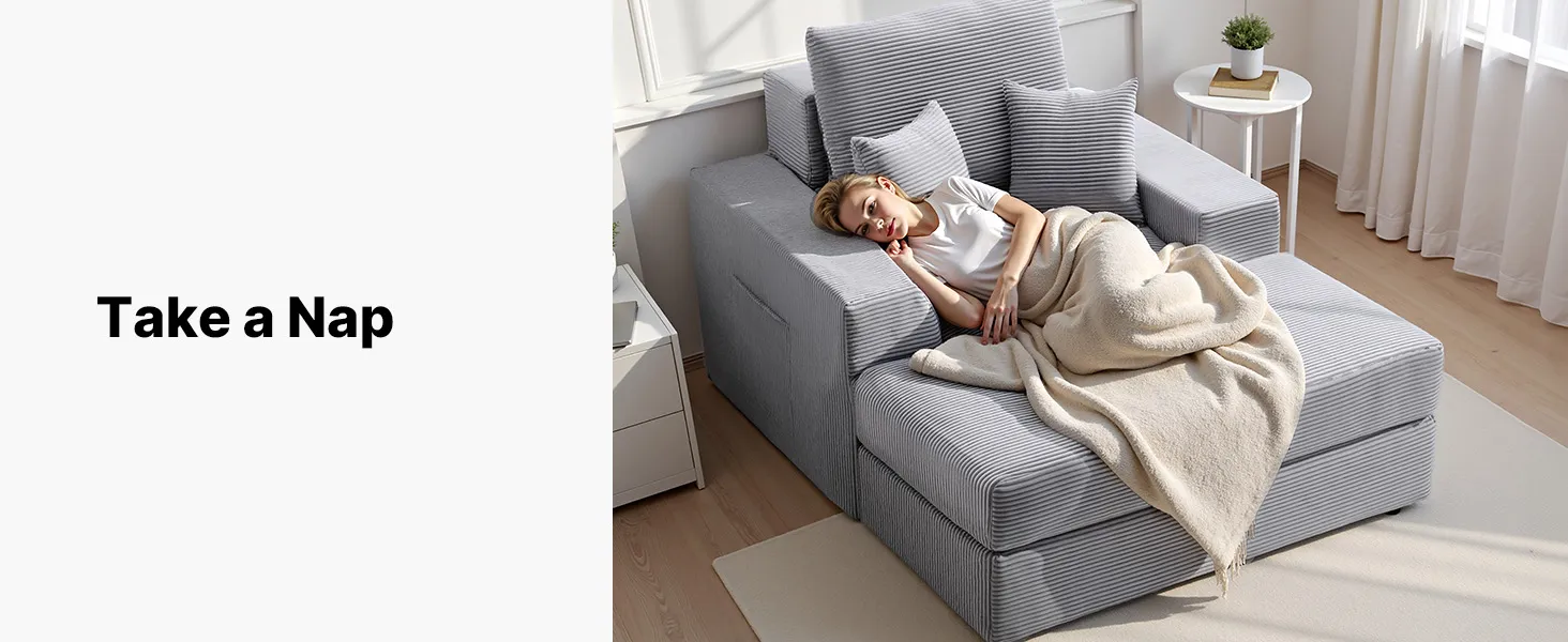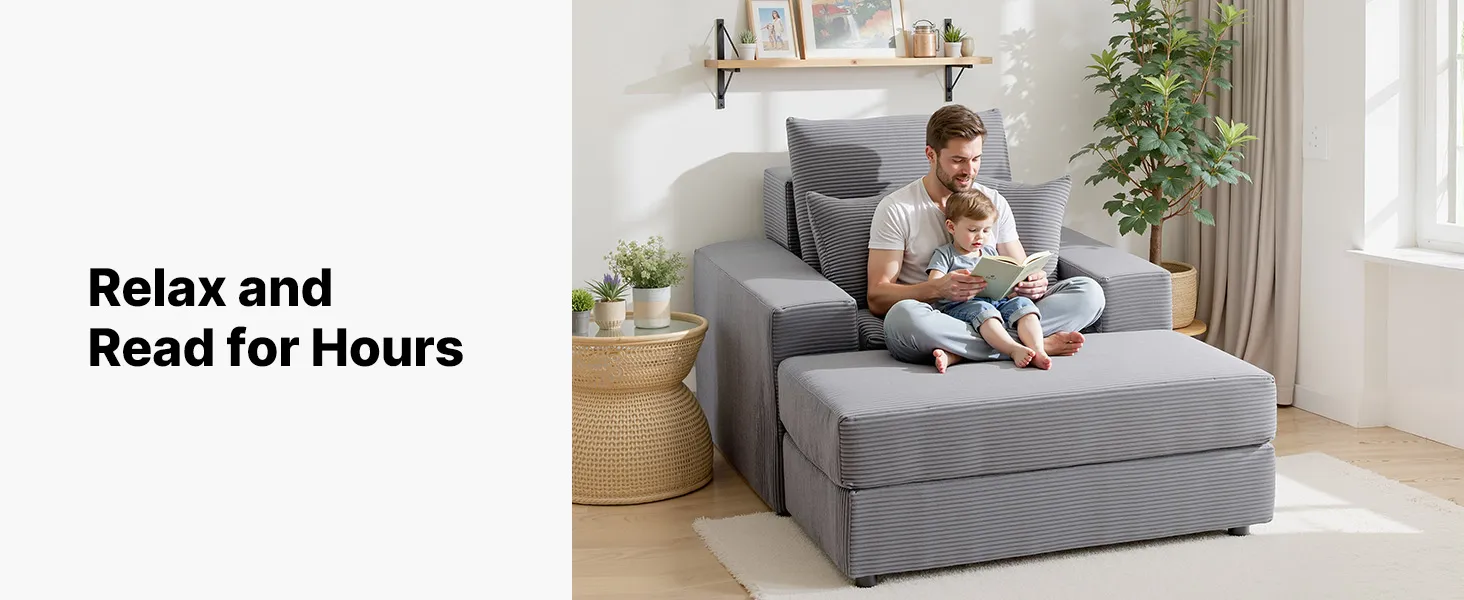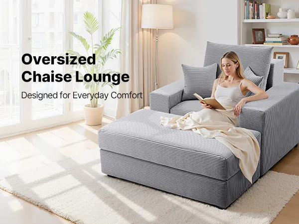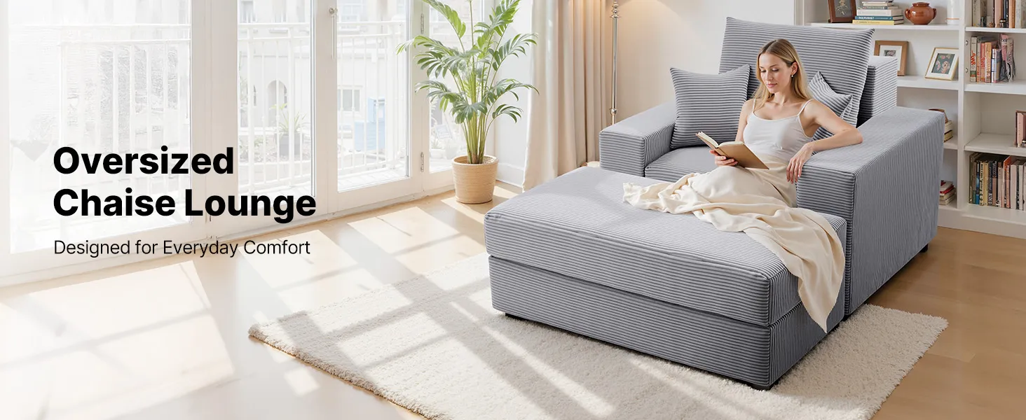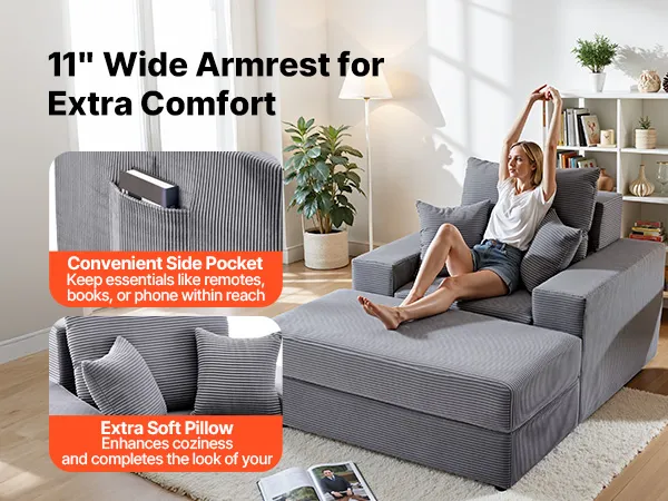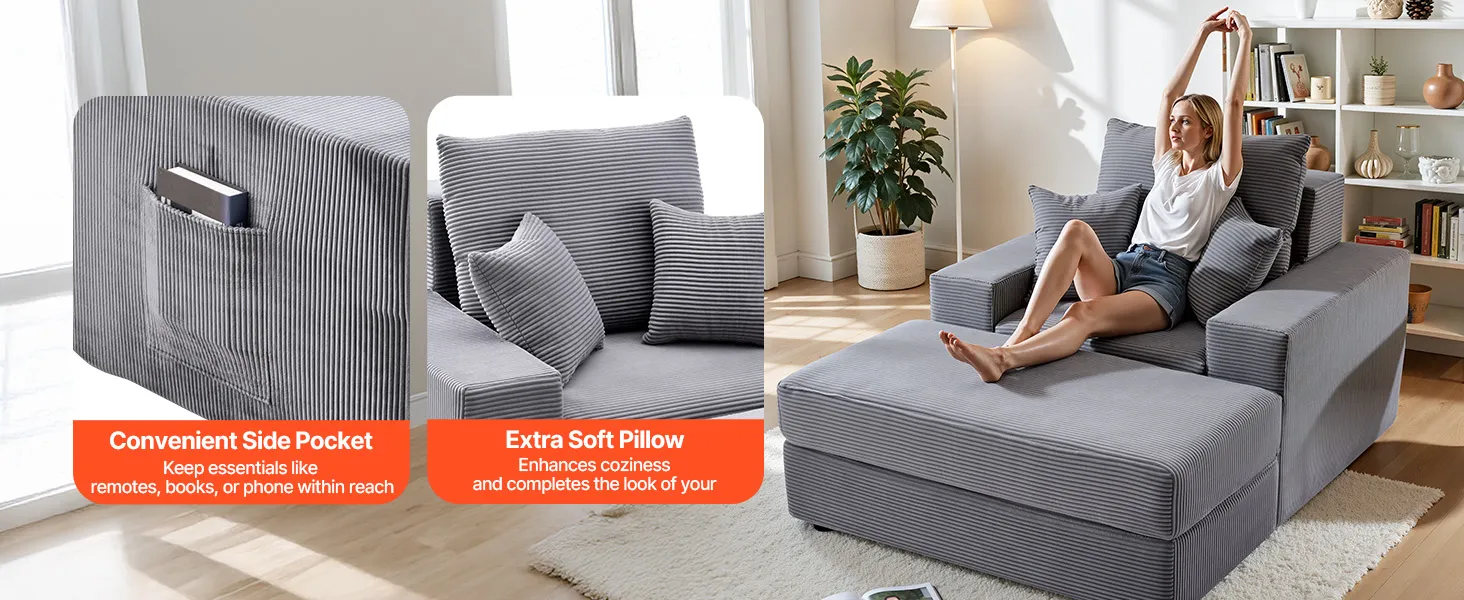 VEVOR Chaise Lounge Chair, 1115 mm Boneless Modular Chaise Lounge Indoor, Oversized Corduroy Reading Chair with Throw Pillows & Armrests, Deep Seat Sofa Couch Sleeper for Living Room, Bedroom, Grey