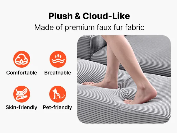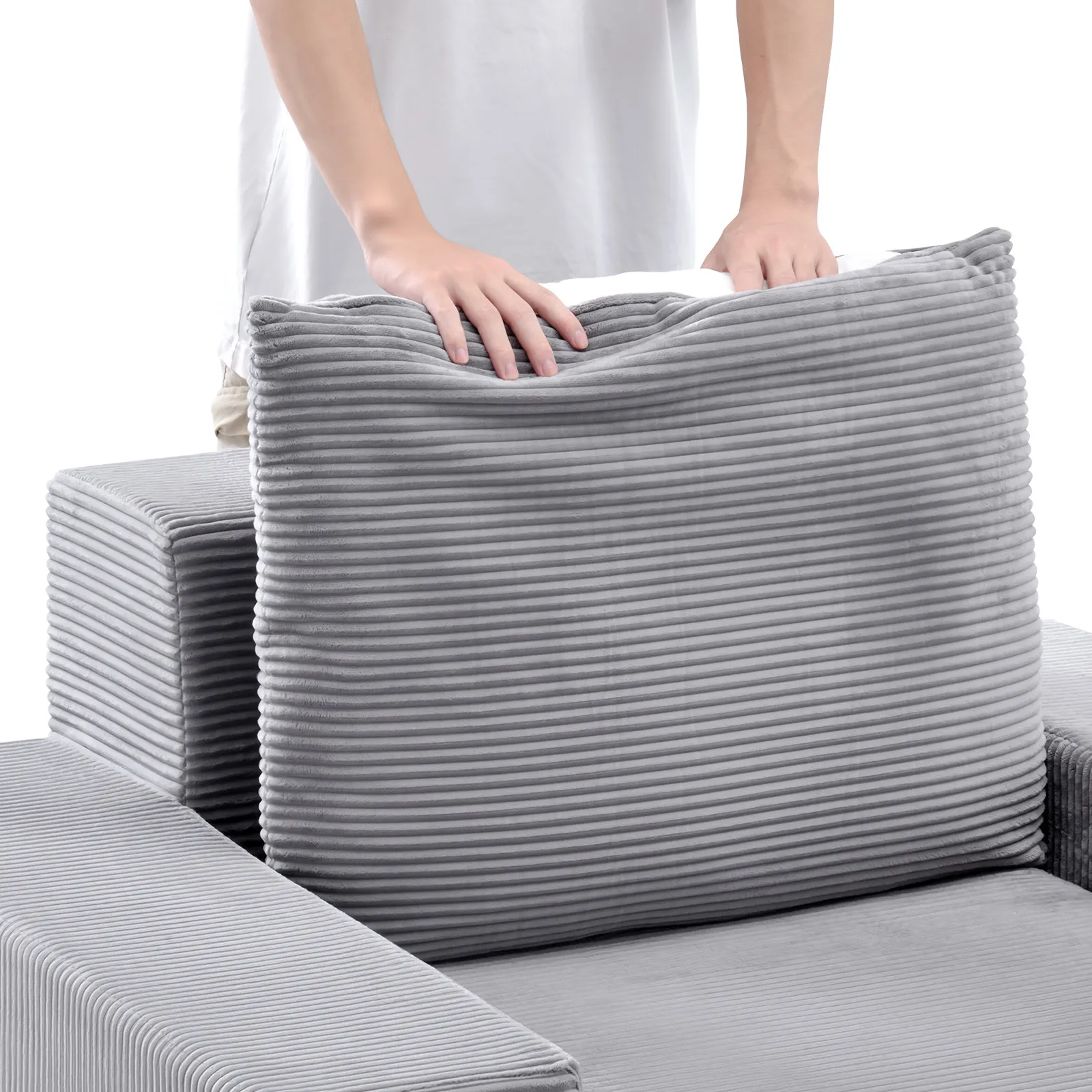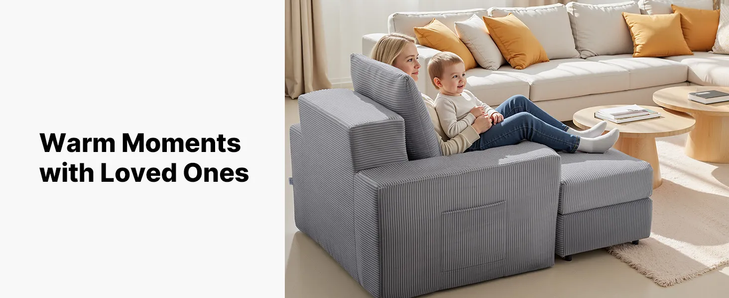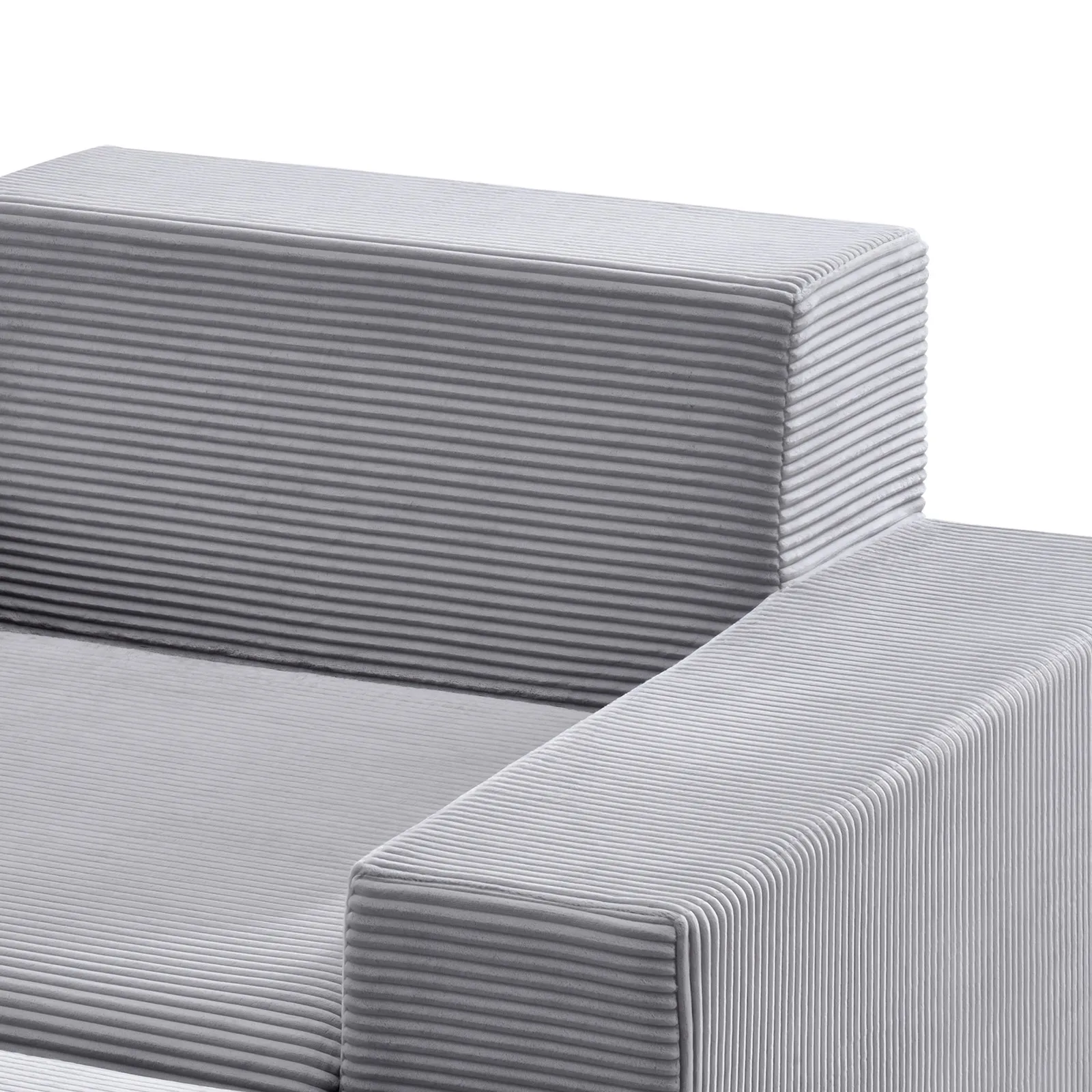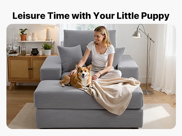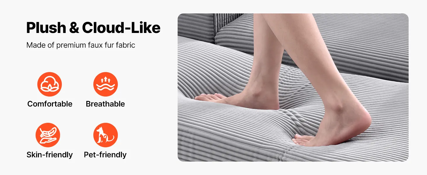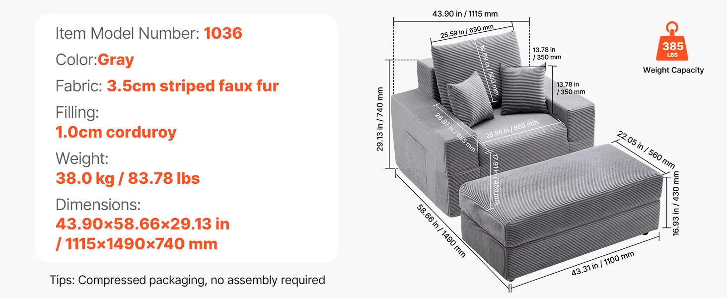 VEVOR Chaise Lounge Chair, 1115 mm Boneless Modular Chaise Lounge Indoor, Oversized Corduroy Reading Chair with Throw Pillows & Armrests, Deep Seat Sofa Couch Sleeper for Living Room, Bedroom, Grey
