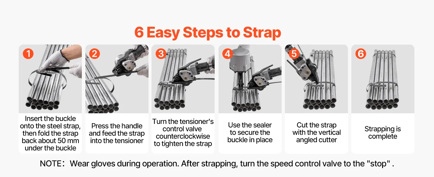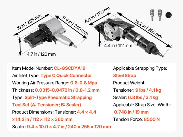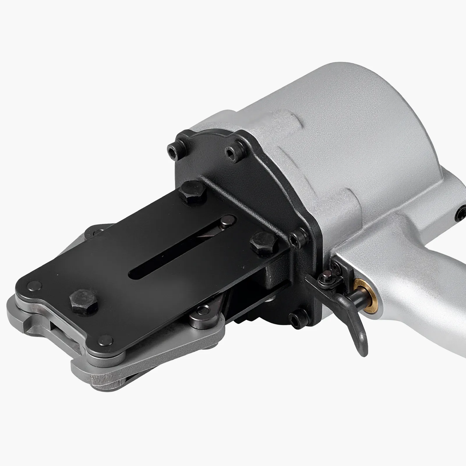 This pneumatic steel strapping tool is designed for steel strapping with a split tensioner and sealer. The design offers flexible use and even supports two-person teamwork.