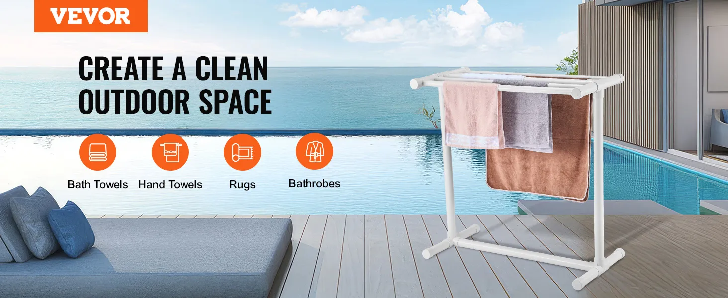 • Использование на улице и в помещении: Эта вешалка для полотенец из ПВХ является идеальным решением для сушки и хранения в бассейнах, на пляжах, в домиках у озера, кемпингах, внедорожниках и многом другом. Наслаждайтесь активным отдыхом с семьей и друзьями во время каникул или в свободное время!