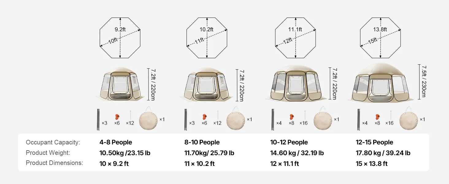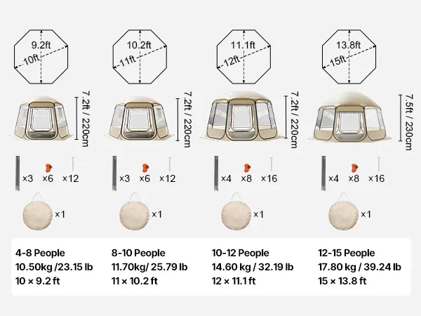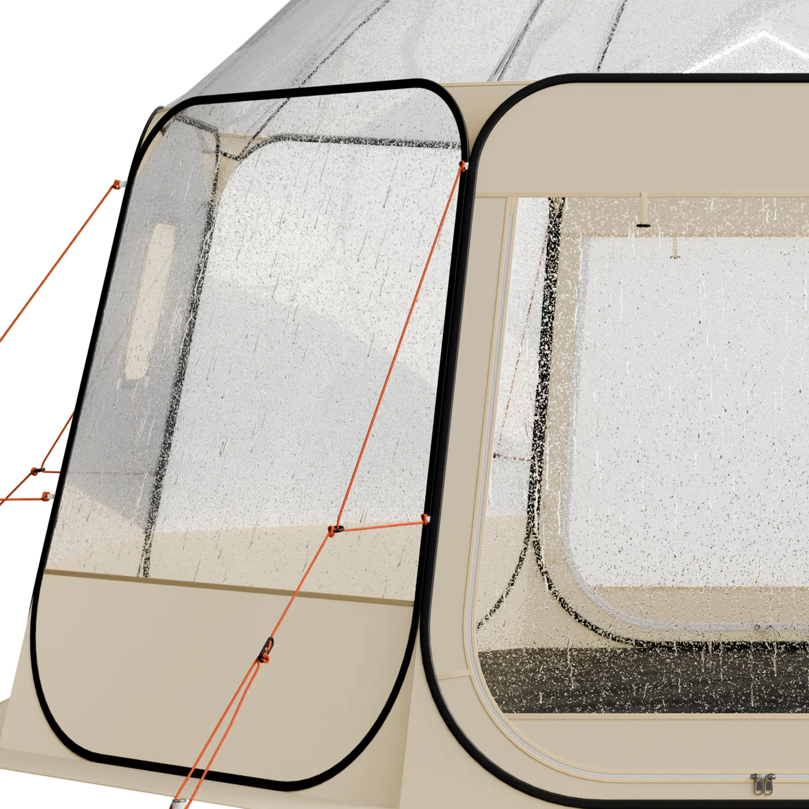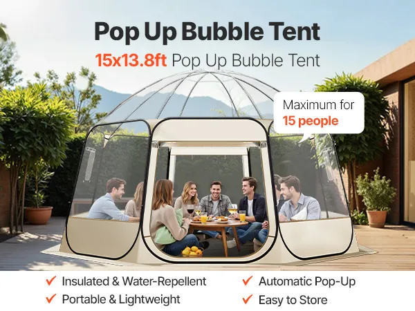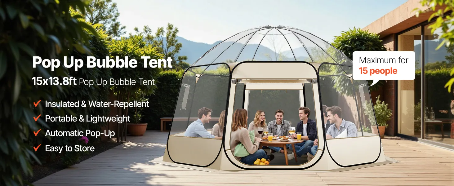 This 12-15 person pop-up bubble tent is made of TPU and 210D Oxford fabric, with steel wire for stability and durability. The pop-up structure allows for quick setup in seconds, making it ideal for outdoor or backyard use. Multiple roll-up side windows let you easily adjust airflow and privacy.