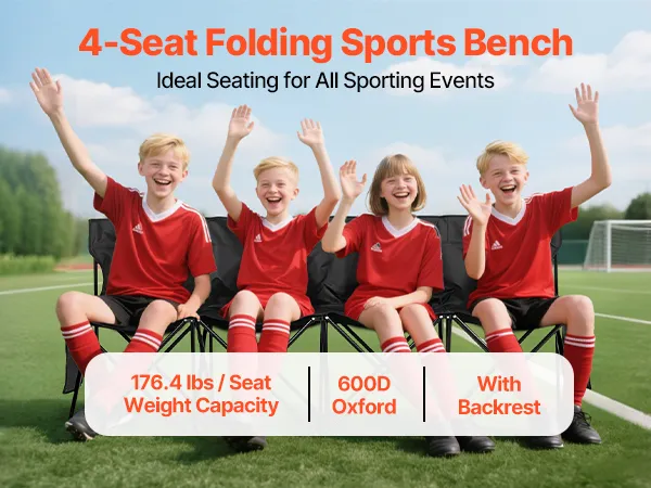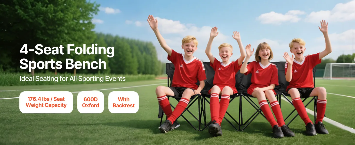 VEVOR Portable Folding Bench, 4 Seat Foldable Soccer Bench with Side Pockets and Carrying Bag, Lightweight Sideline Seating with Back Rest for Football, Baseball, Camping, Outdoor Events, Black
