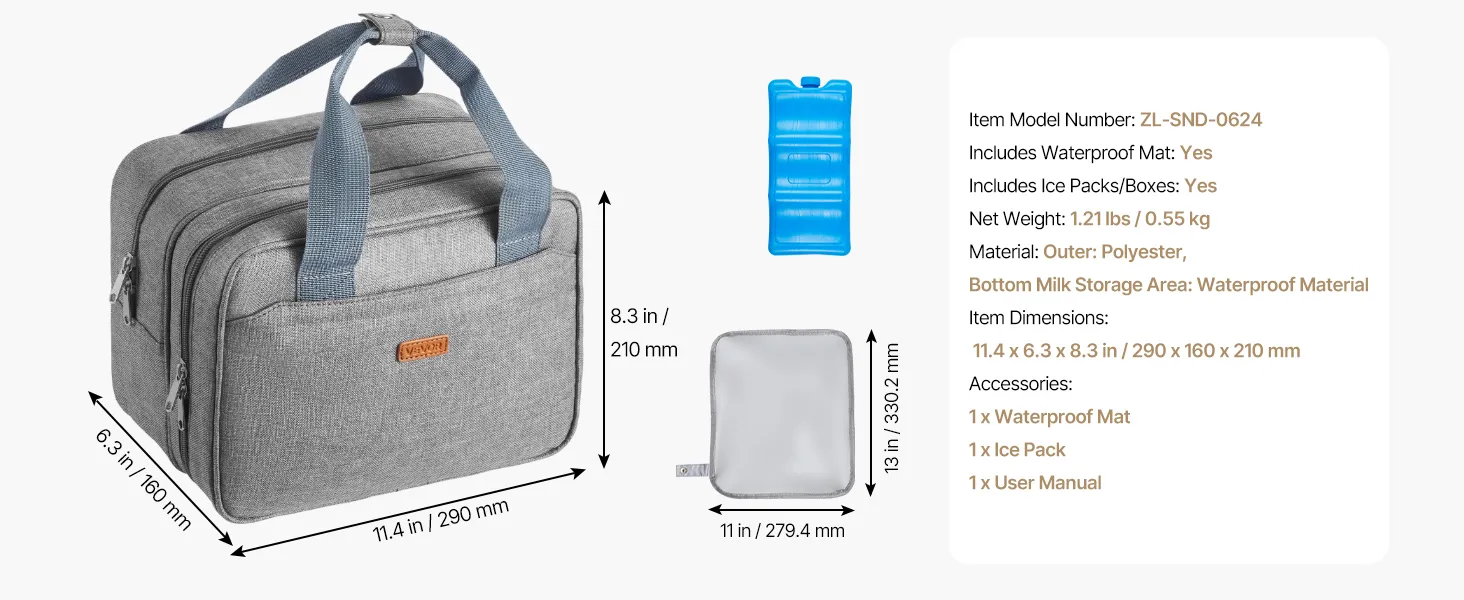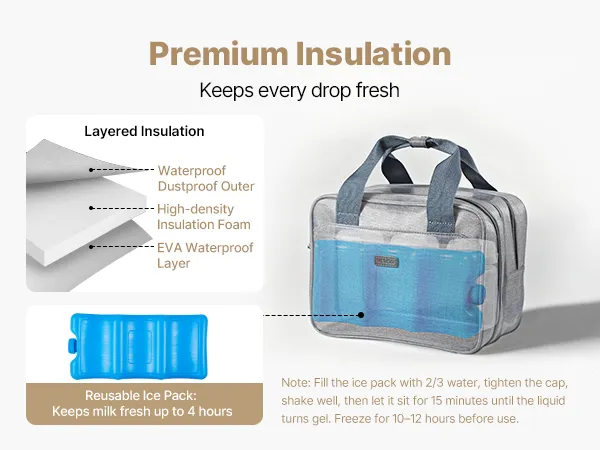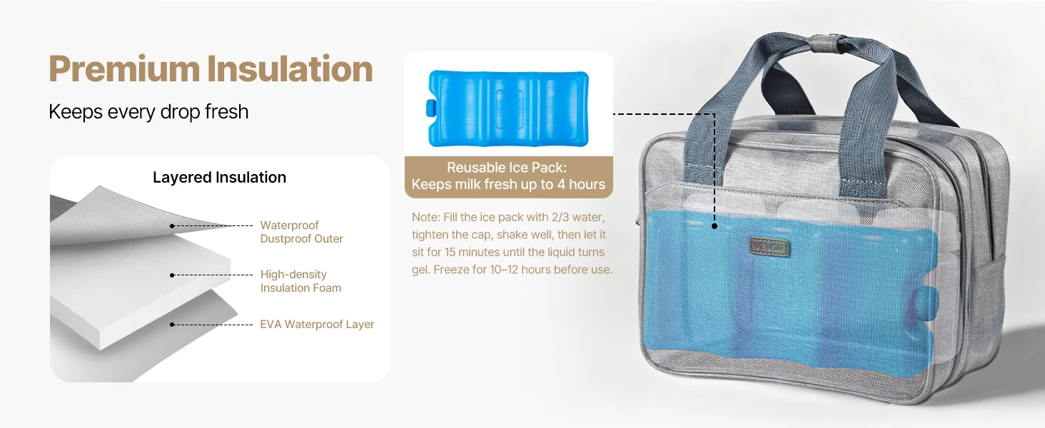 The three-layer design features a waterproof shell, EVA foam for insulation, and a scratch-resistant lining. With ice packs, our breast pump travel bag keeps milk fresh for up to 4 hours with ease.