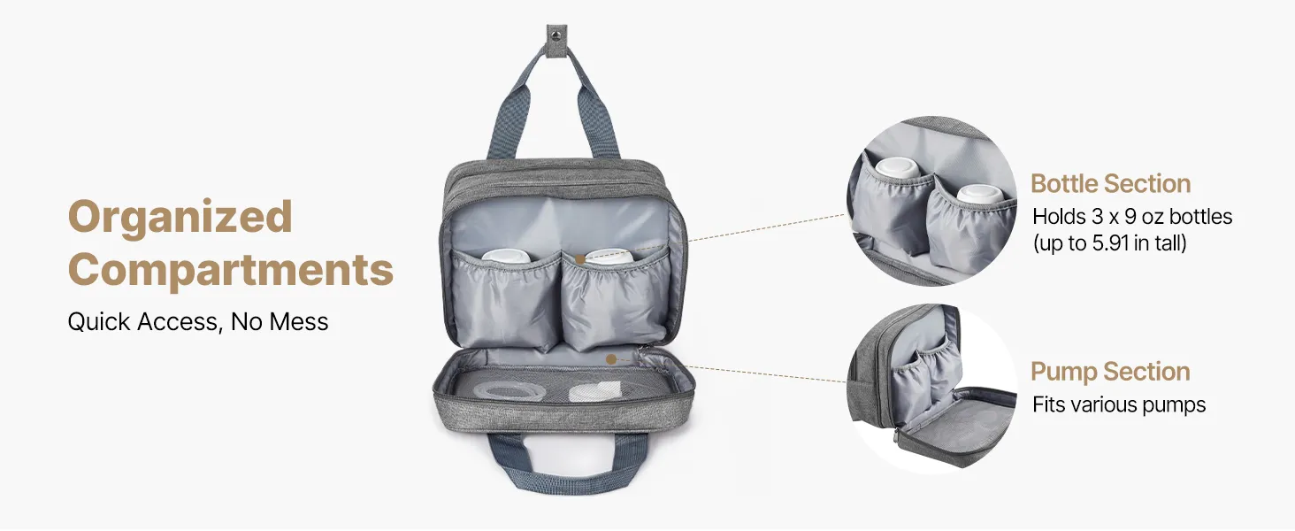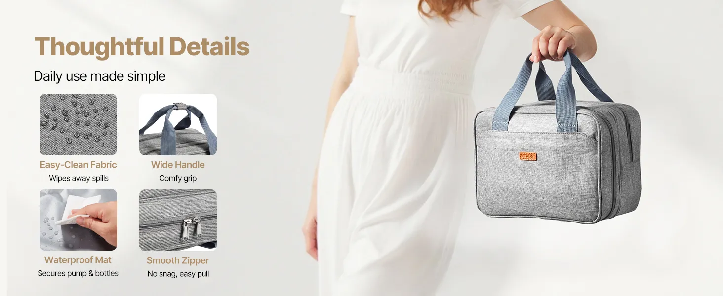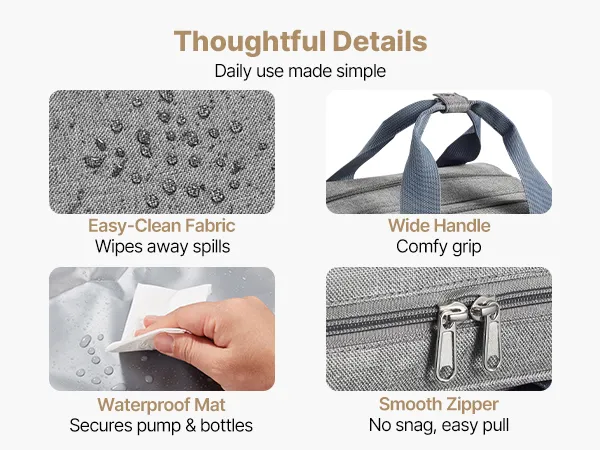 The wide handle of the breast pump storage bag make carrying comfy. The waterproof pad helps secure bottles from leaks. Easy-clean fabric wipes down fast, and smooth zippers glide with ease.