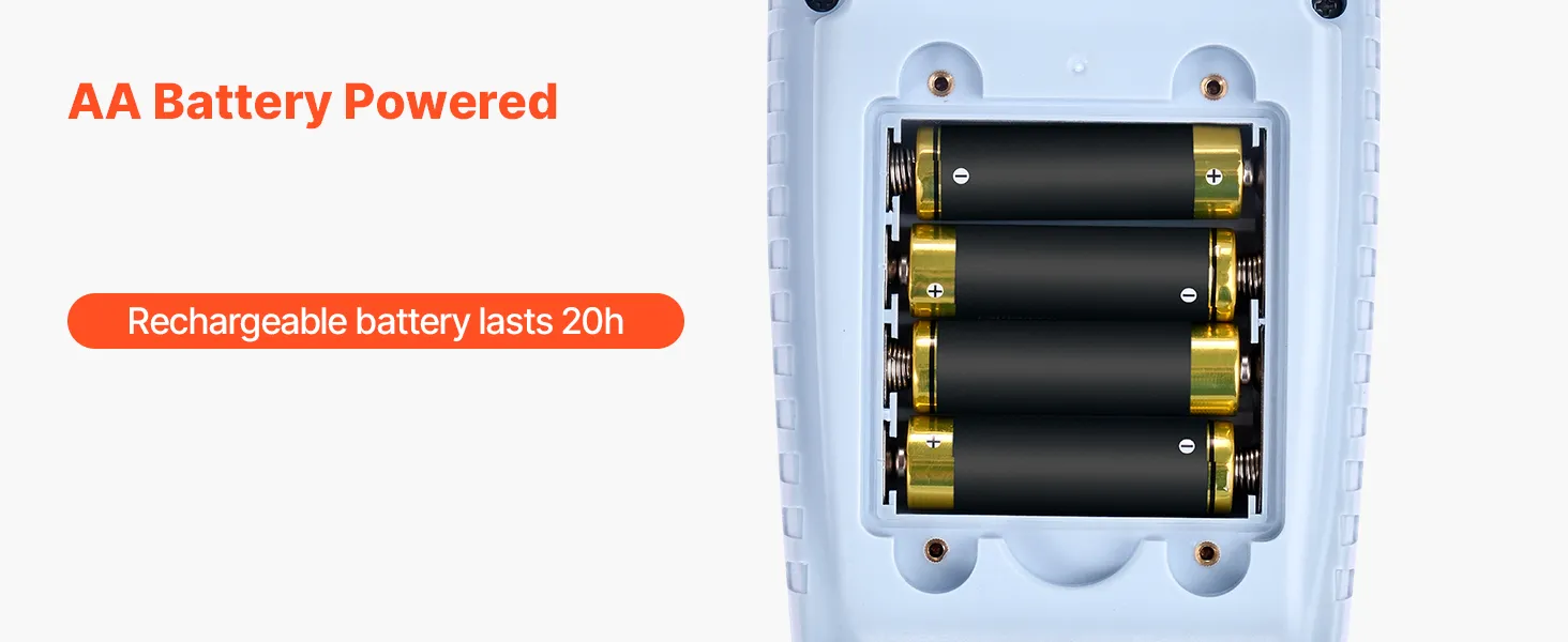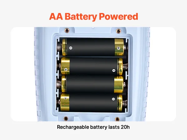 A: It uses a rechargeable battery, supporting over 20 hours of continuous measurement.