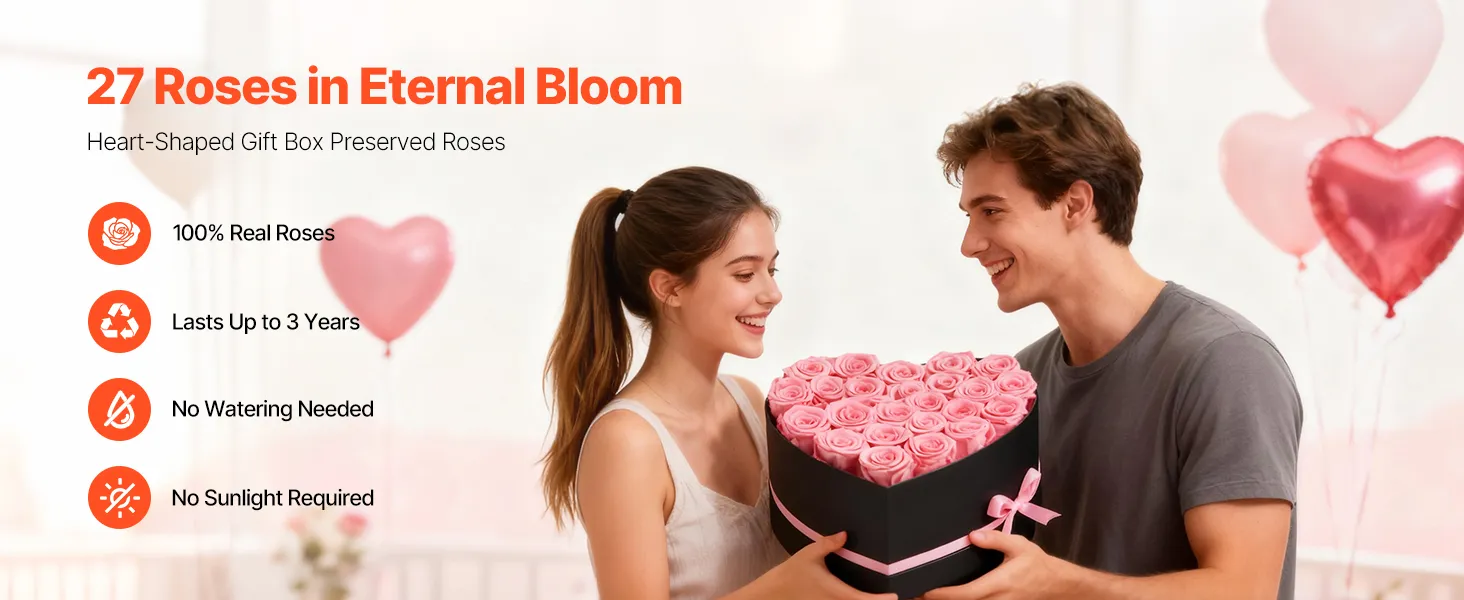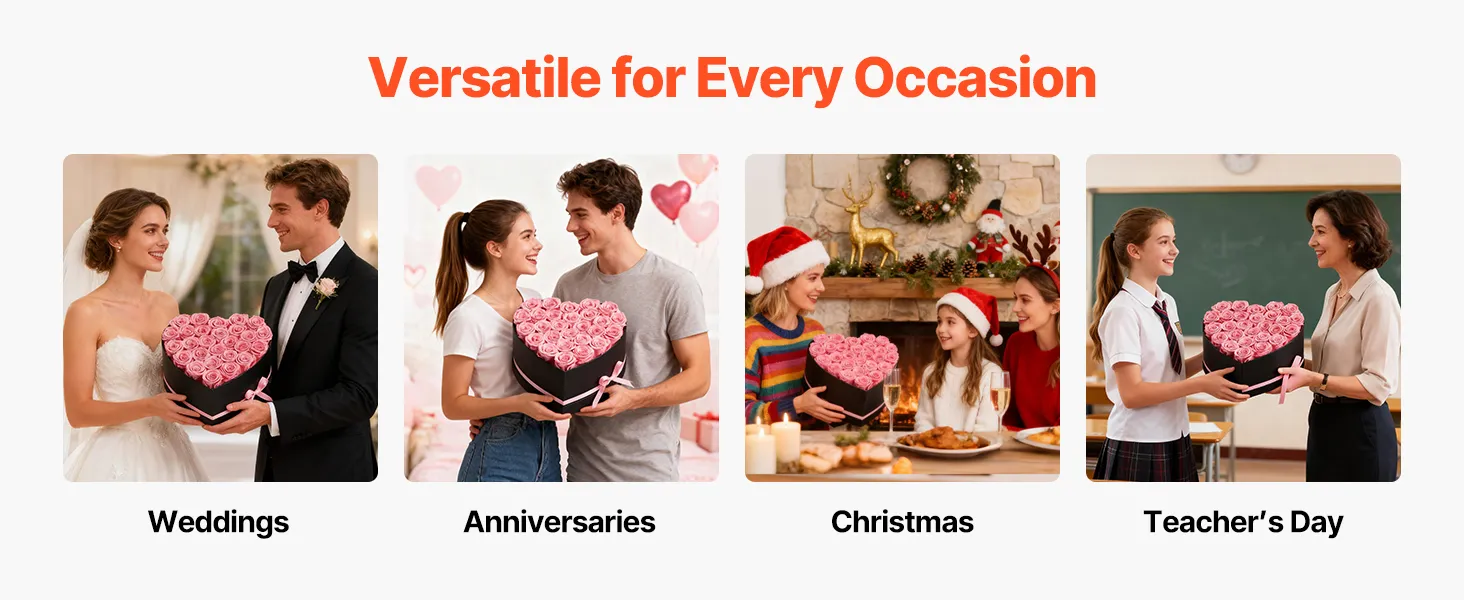 Made from 100% real roses with full blooms and vibrant colors, these forever roses require no watering or sunlight, turning every celebration into a lasting romantic memory.